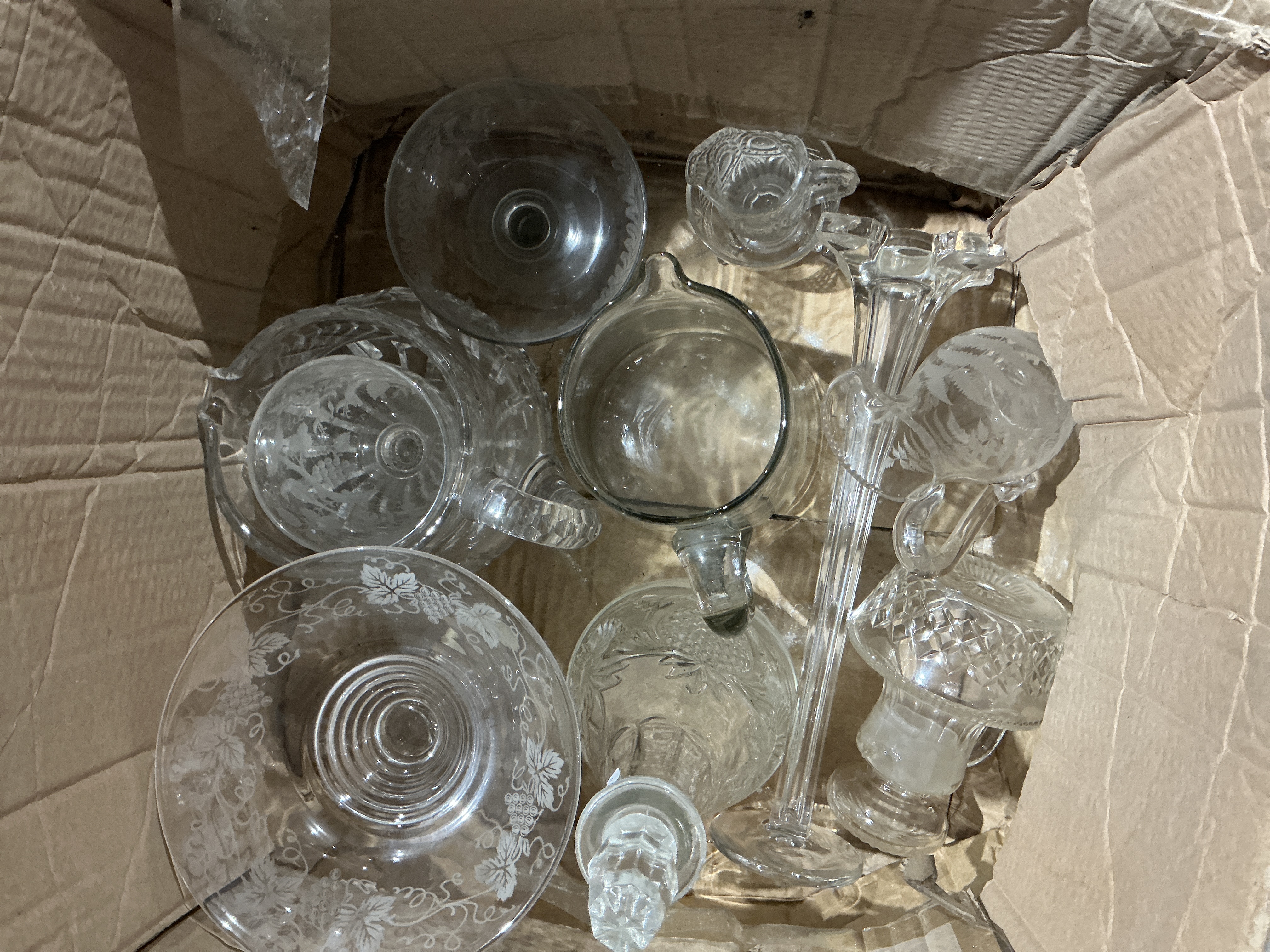 A collection of 12 pieces of clear colorless glass and crystal tableware and barware, spanning various styles and decorative techniques. The lot includes items consistent with production from the late Victorian era through the mid-20th century vintage period. Functional items include two stoppered cruets or decanters, one featuring a deeply cut diamond pattern and the other decorated with delicate acid-etched floral and foliage designs. There are three pitchers or creamers, ranging from plain pressed glass to faceted and etched examples. The collection also contains three bowls or compotes, notably one large bowl heavily etched with a grapevine pattern around the rim. The remaining pieces are fragments and bases, including one broken glass stem, one stemmed base, one large glass shard, and a small stemmed glass fragment. The collection exhibits a range of manufacturing methods including pressed glass, deep facet cutting, and acid etching.