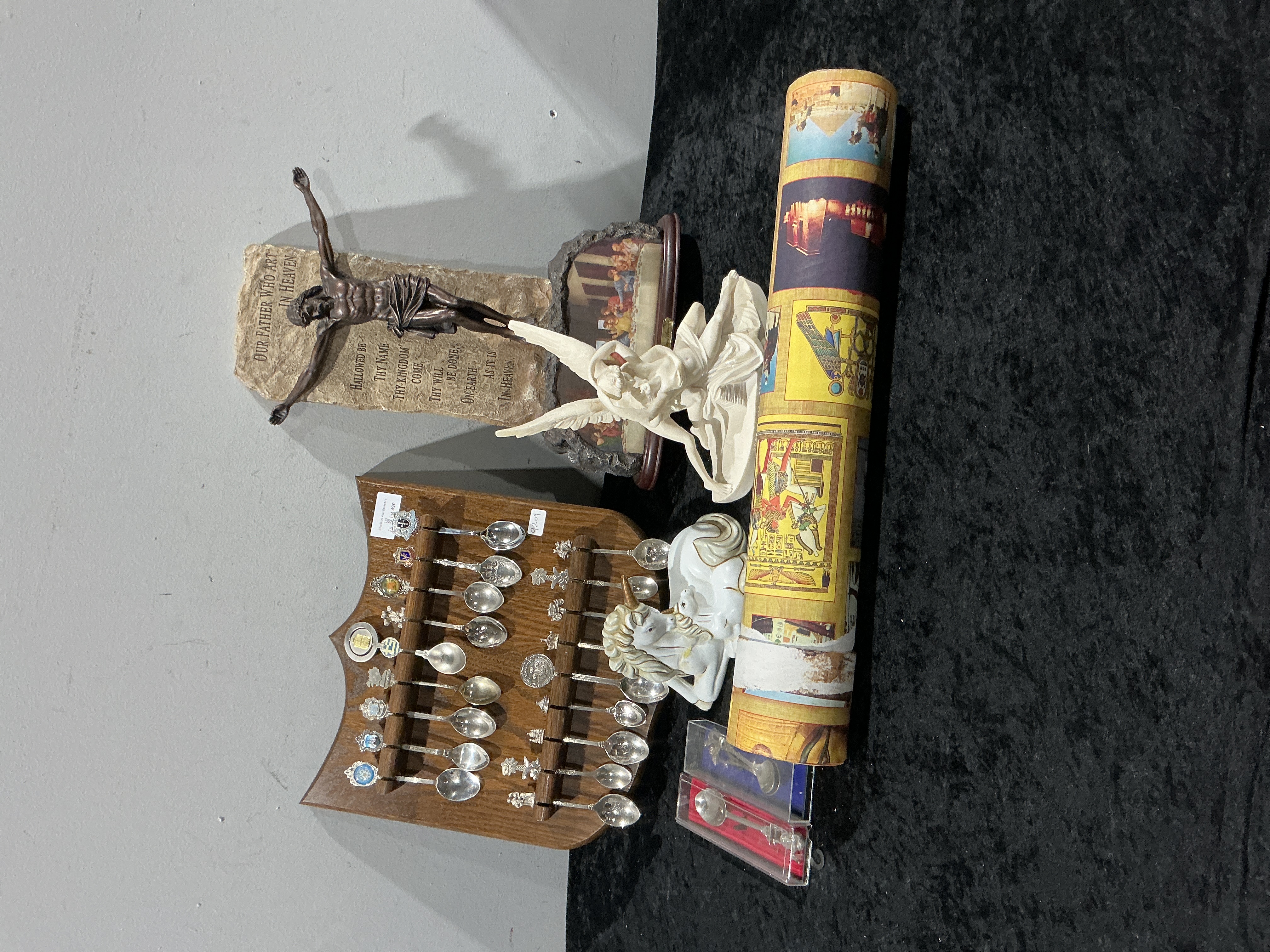 This collection consists of 28 items of mixed decorative and souvenir collectibles. The largest component is a wooden, curved display rack holding 20 silver-toned souvenir spoons, arranged in four rows of five. These spoons feature various figural finials and enamel crests, likely representing travel destinations or heraldic symbols. Two additional silver-toned souvenir spoons are included in individual plastic presentation cases, bringing the total number of spoons to 22. A significant item is a rolled cylindrical print, identified through research as an Egyptian Papyrus or reproduction thereof, decorated with colorful scenes of pharaohs, hieroglyphics, birds, and imagery of the Pyramids, consistent with market descriptions of hand-painted Egyptian souvenir art. Religious items include a faux-stone composite plaque inscribed with the Lord’s Prayer and mounted with a bronze-toned Corpus Christi figure. A small framed image, likely depicting The Last Supper, is positioned near the plaque. The lot also contains two white composite figurines: a reclining winged creature and a large figure of a winged angel or classical nude. All items appear to be mid-20th century or later decorative pieces.
