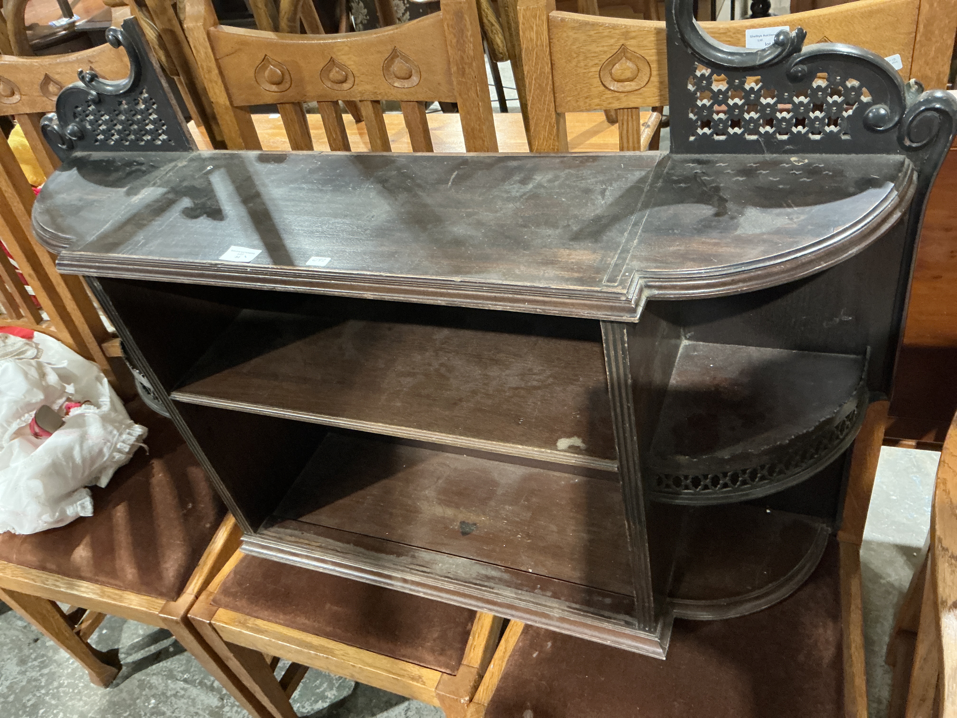 A single wall shelf or whatnot constructed of wood with a dark stain, likely dating to the late Victorian or Edwardian period. The unit features two main rectilinear shelves and rounded lower side compartments. The structure is supported and accented by elaborate, symmetrical, scrolled supports flanking the upper surface, topped by pierced decorative fretwork. Visible markings include small white auction inventory stickers on the top shelf, one of which appears to reference “Shelbys Auction Ltd.”