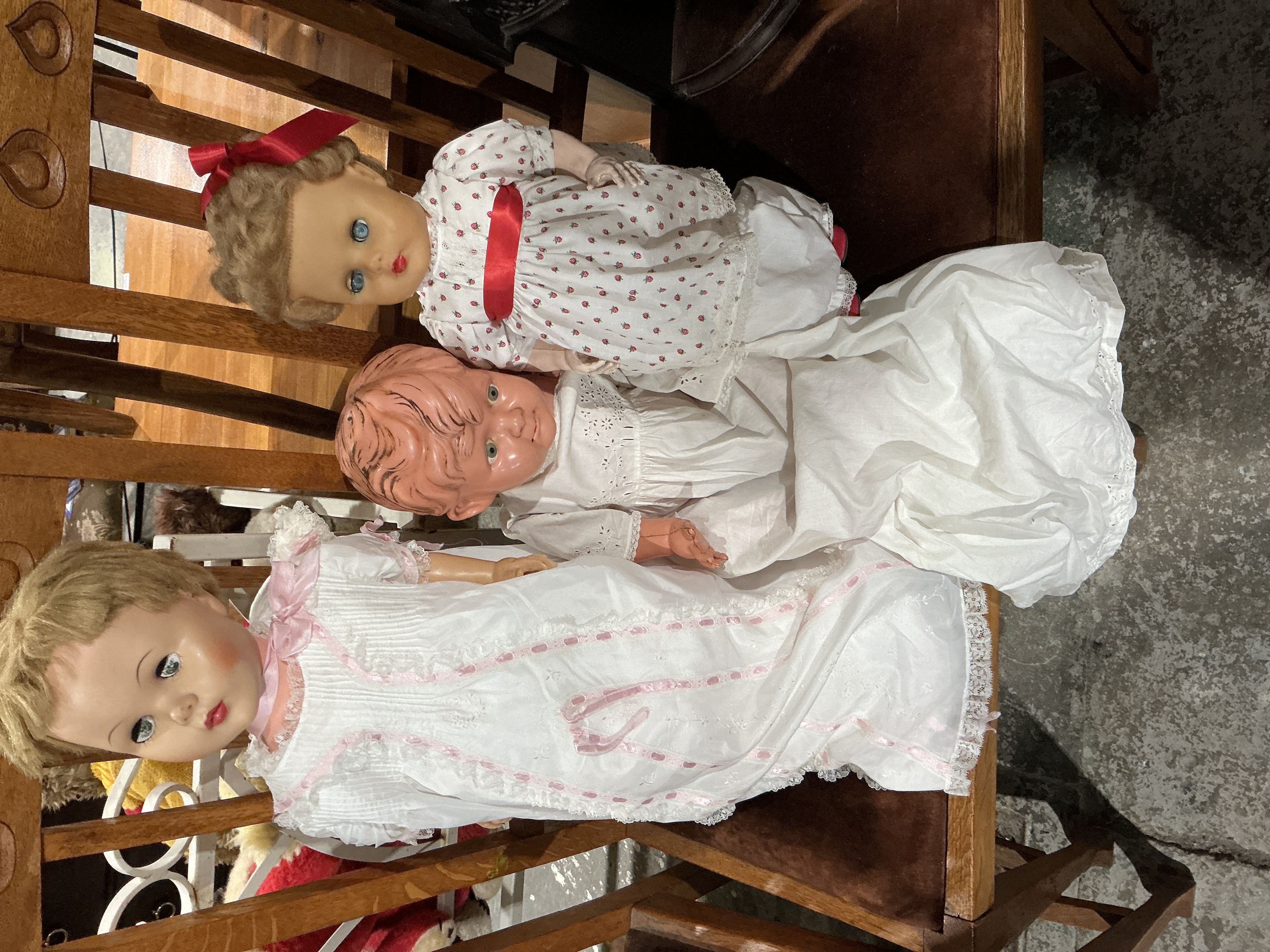 A collection of three vintage dolls, likely constructed of composition or hard plastic, dating to the mid-20th century. The group consists of two larger female dolls and one smaller baby doll. The doll on the left features light hair and is dressed in a long white gown detailed with pintucks, lace trim, and pink ribbon accents. The central baby doll has molded, reddish-pink hair and wears a white eyelet-embroidered dress. The doll on the right has curled hair and wears a white dress patterned with red strawberries, accessorized with a red satin sash and matching hair ribbon. All three dolls feature painted facial details and inset eyes, consistent with mid-century manufacturing. No manufacturer markings or identifying text are discernible upon visual inspection.