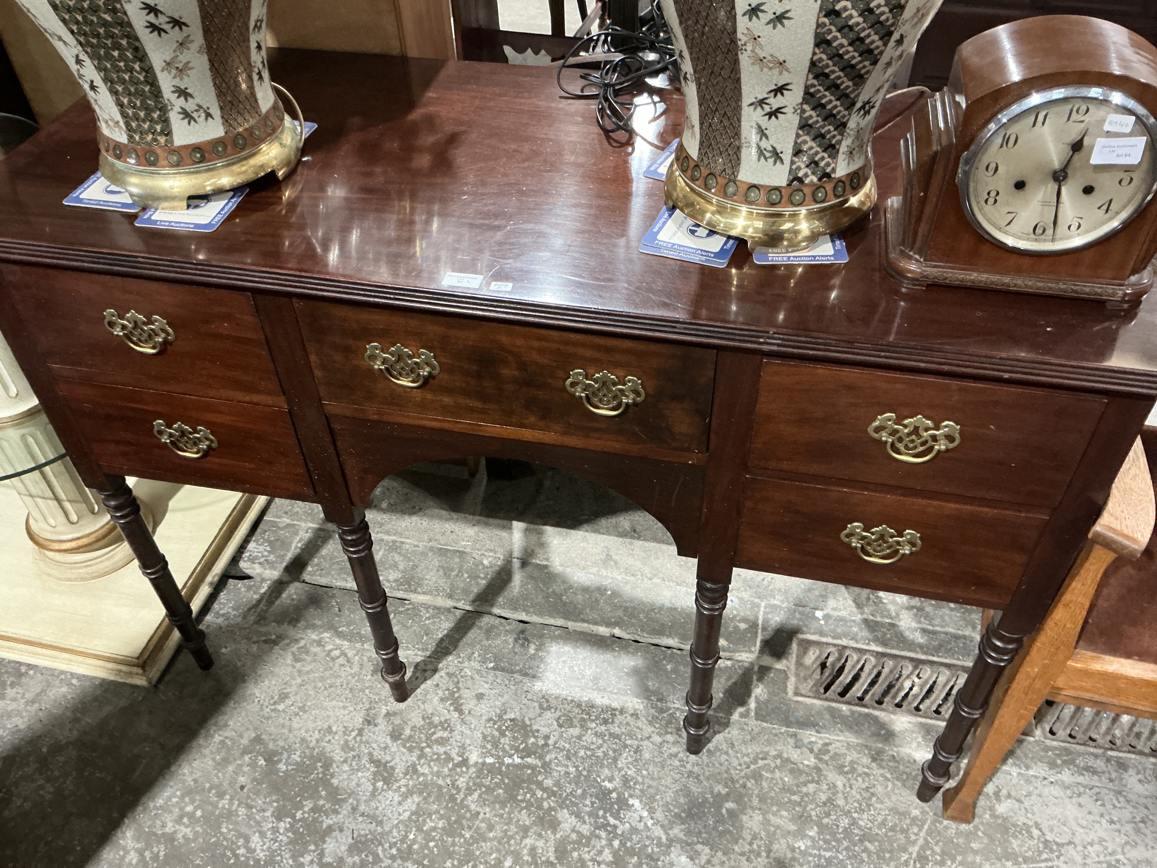 A dark reddish-brown wooden lowboy or dresser base, executed in the English Georgian or Queen Anne Revival style. The form features a rectangular top situated above a frieze containing five drawer fronts: three shallow drawers across the top and two deeper drawers flanking a central shaped apron below. The drawers are fitted with ornate brass-toned bail handles featuring pierced backplates. The piece is supported by four slender ring-turned legs. The construction and style are consistent with early 20th-century revival furniture, often utilizing mahogany or similar hardwoods.