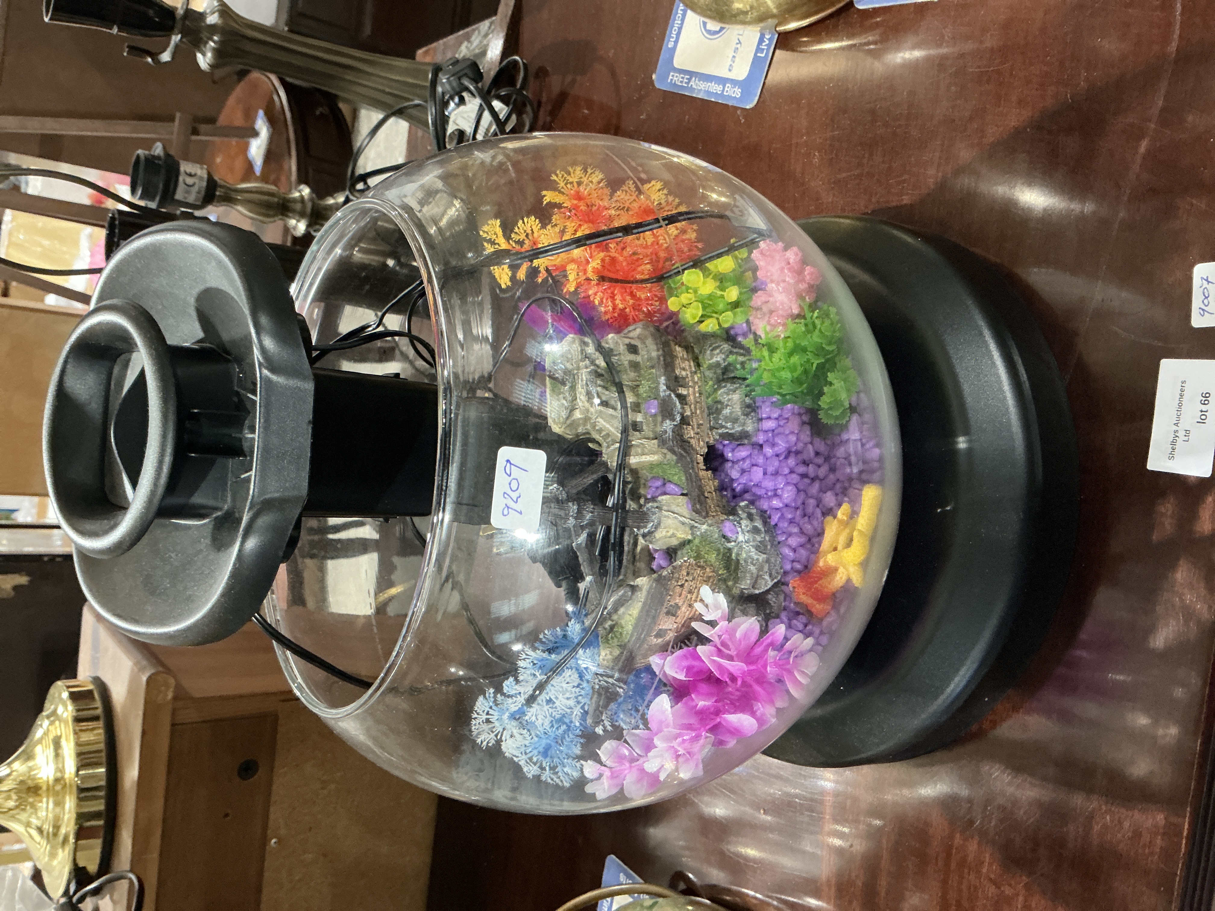 A modern tabletop aquarium kit identified through web consensus as the Tetra Waterfall Globe Kit, 1.8 Gallons capacity. The unit features a spherical clear glass bowl mounted on a black plastic base, topped with a corresponding black plastic housing designed to accommodate an integrated filtration or pump mechanism, creating a waterfall effect. The interior is decorated with various multicolored plastic artificial plants (including shades of pink, blue, orange, red, and green), a faux resin rock formation styled as an ancient ruin or bridge, and a layer of purple plastic gravel substrate. Visible markings include a white adhesive sticker on the glass handwritten with the number 9209, and a paper tag near the base reading Shellys Auctioneers Ltd lot 66.