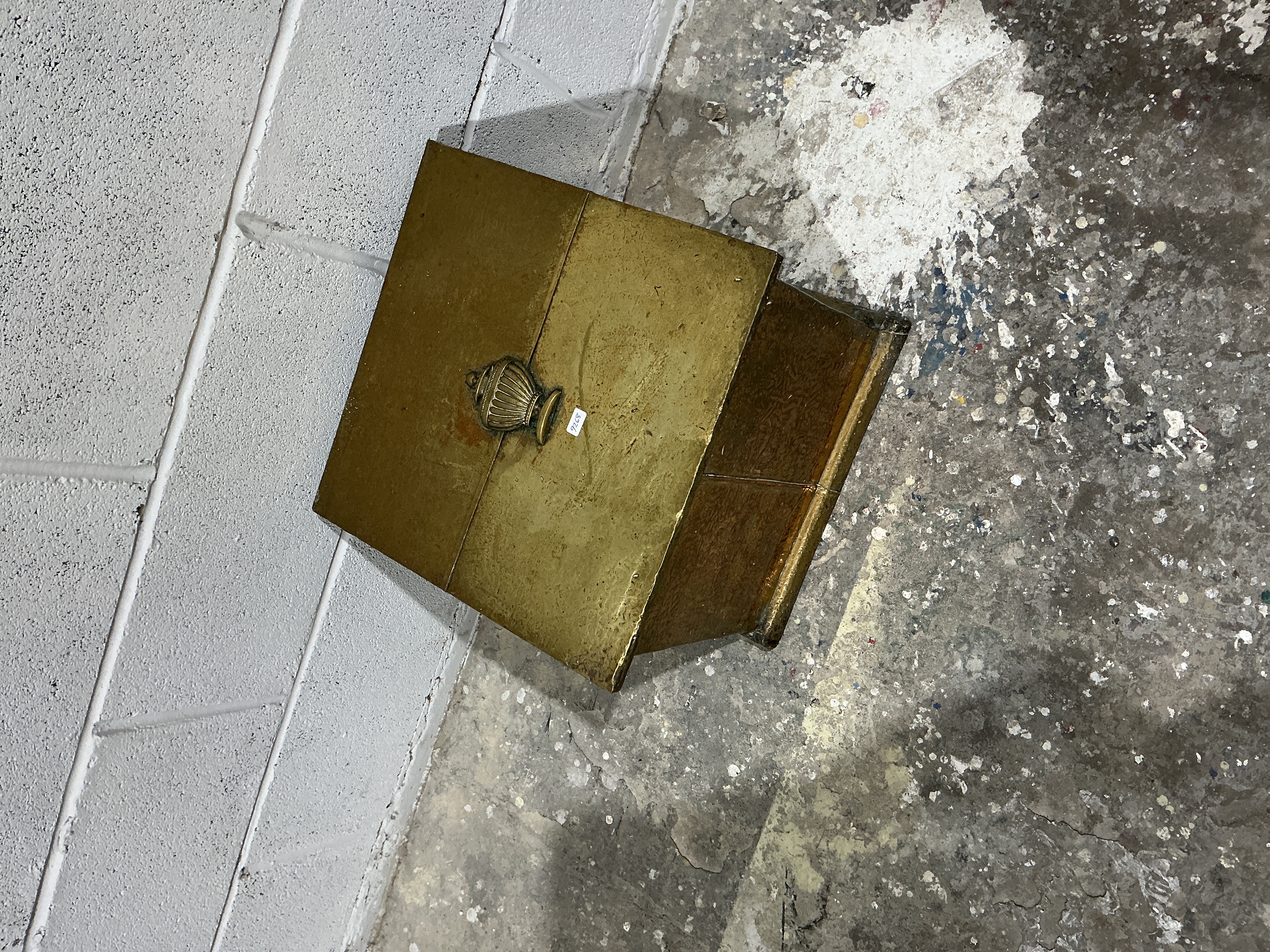A vintage or antique lidded storage box, identified through market consensus as a coal scuttle or coal bucket box. The rectangular chest is constructed of wood or composite material and finished externally in a distressed gold or bronze metallic paint or gilt, mimicking the appearance of traditional brass coal scuttles. The front face features a decorative metal handle or escutcheon molded in the shape of a classical urn. The interior is hinged and lined with a material, likely metal, showing heavy signs of oxidation and rust-colored residue consistent with use as a coal storage vessel. A small, illegible white rectangular sticker is affixed below the handle on the front face.