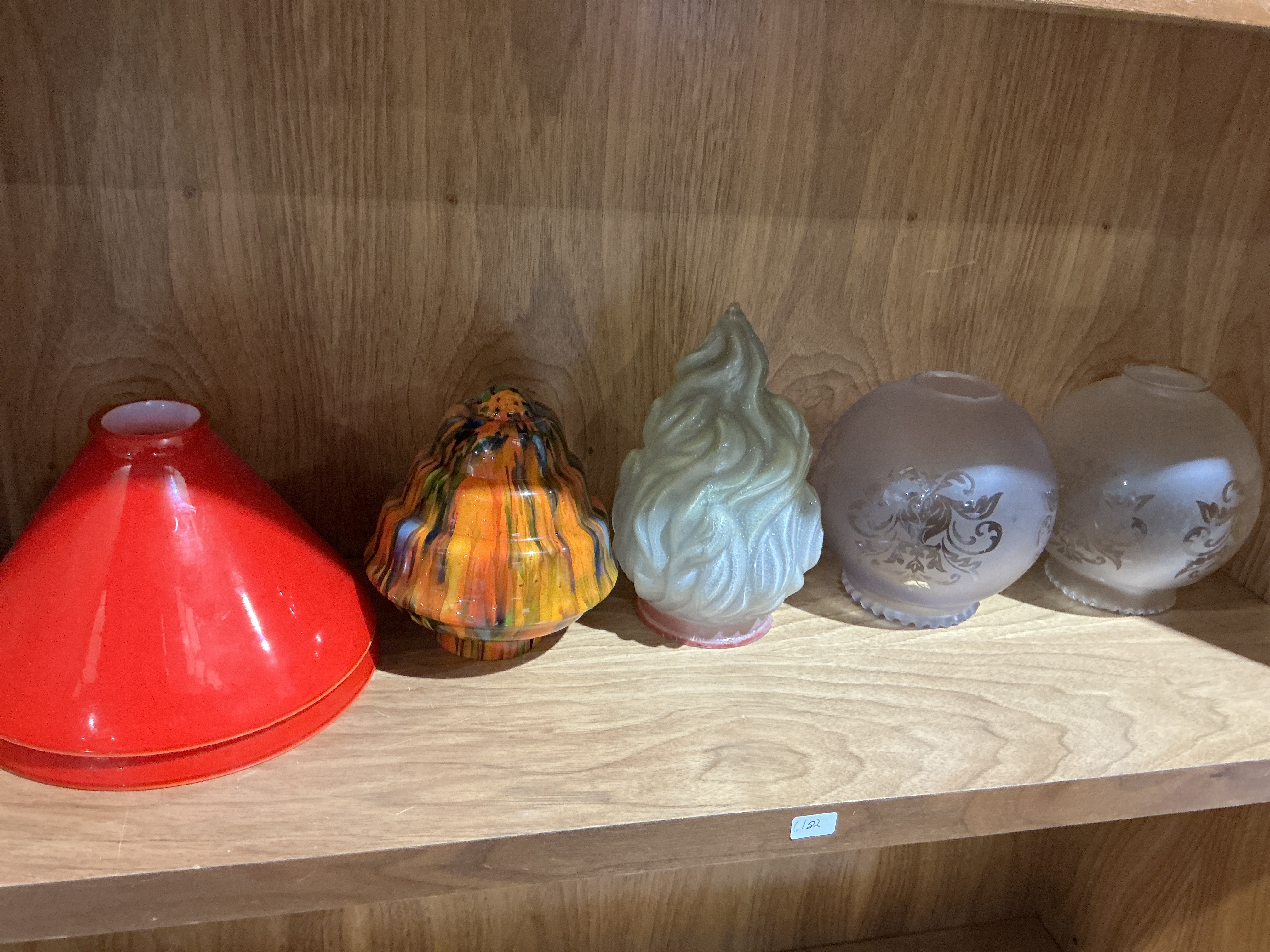 A collection of glass lamp shades featuring Vianne cased red glass shades of conical form. The assortment also includes a multi-colored swirled glass shade with orange and yellow tones in a stepped-ribbed design, an iridescent flame-shaped shade, and frosted glass spherical shades with etched foliate patterns and scalloped rims. The pieces exhibit various glassmaking techniques including casing, iridescence, and acid-etching.