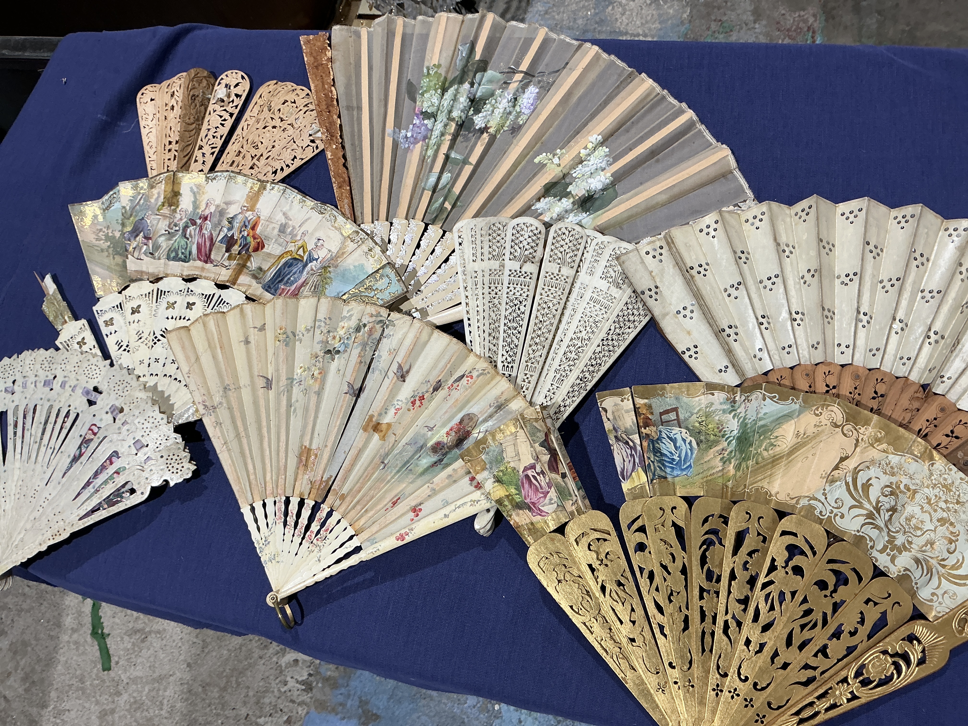 This selection of various antique and vintage hand fans includes a range of styles, materials, and decorative motifs. The collection features folding fans with paper or fabric leaves adorned with hand-painted and printed designs, including floral sprays, birds, and romanticized figures in 18th-century garden settings. Several pierced brisé fans are present, showcasing intricate openwork patterns in materials such as bone, wood, or early synthetic substitutes. Notable examples include a fan with a large gilded and ornate guard and stick assembly, and another with a simple repeating dotted pattern on a pleated leaf. This selection of various fans includes multiple examples that need repair to the leaves and structural components.