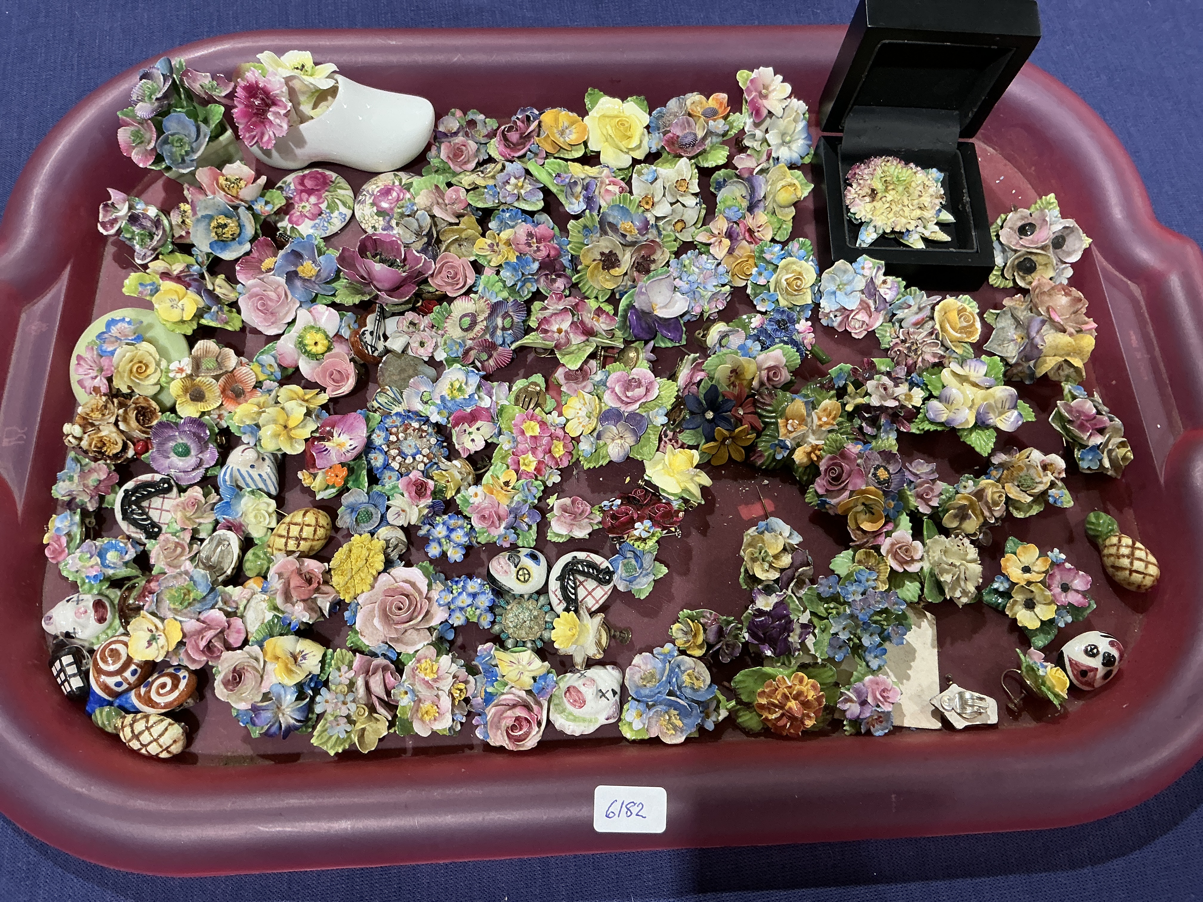 A collection of vintage porcelain and bone china floral ornaments and jewelry, primarily consisting of hand-painted brooches and pins. The assortment features a wide range of botanical subjects, including roses, pansies, and mixed bouquets finished in diverse polychrome glazes. Included in the lot is a small ceramic shoe-shaped vase containing floral elements, several novelty-shaped ceramic pins such as pineapples and ladybugs, and a larger floral brooch presented in a black jeweler’s box. The items are displayed on a maroon plastic tray bearing a lot sticker numbered 6182.