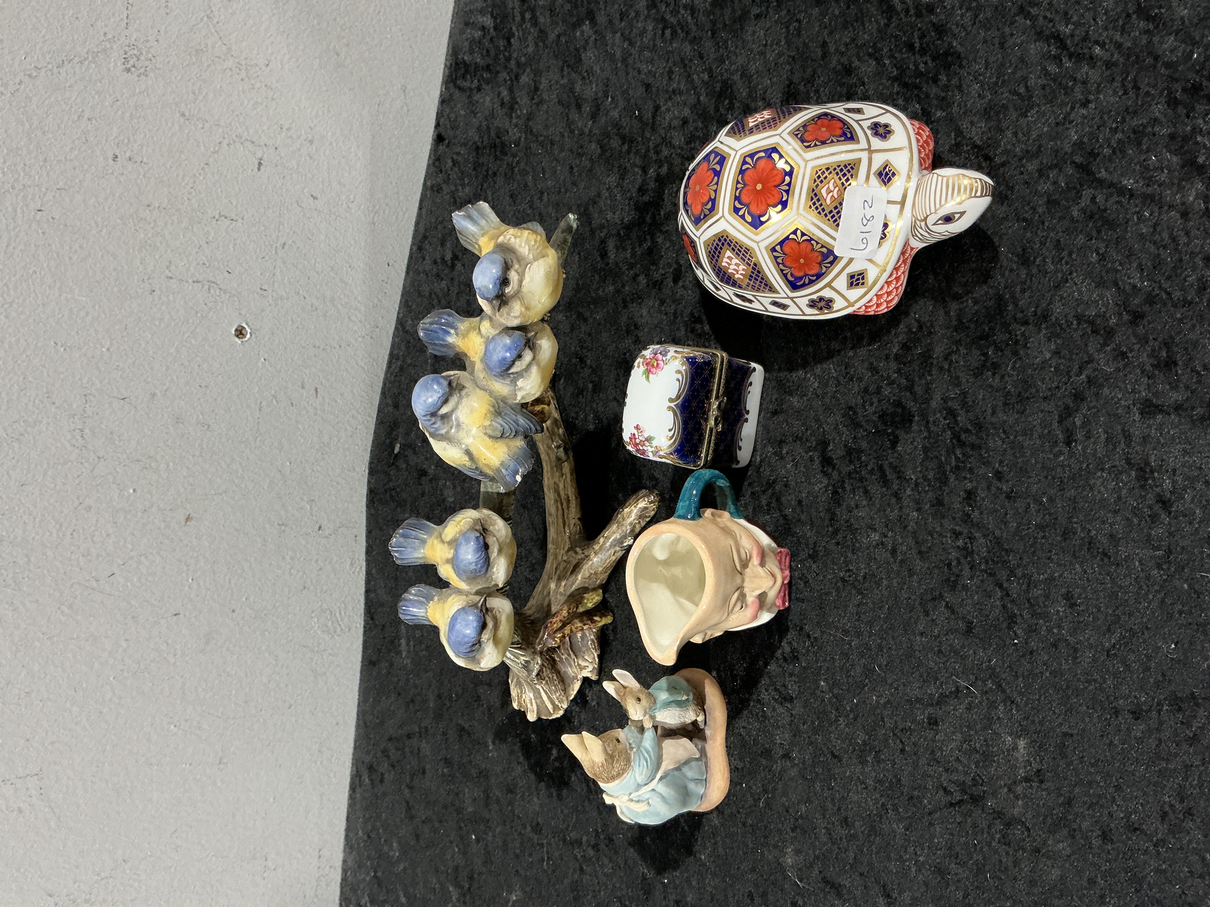 A collection of ceramic and porcelain decorative items featuring a Royal Crown Derby bone china paperweight in the form of a turtle. The paperweight is decorated in a traditional Imari pattern and features a silver-toned stopper and a red backstamp on the underside. The group also includes a Beswick The World of Beatrix Potter figurine titled Mrs. Rabbit and Peter, a Tony Wood Studio character jug, and a miniature porcelain hinged trinket box with cobalt blue and floral decorations. Additionally, the collection contains a ceramic ornament depicting multiple blue-winged birds perched on a branch. The items are primarily 20th-century collectibles with various maker marks present.