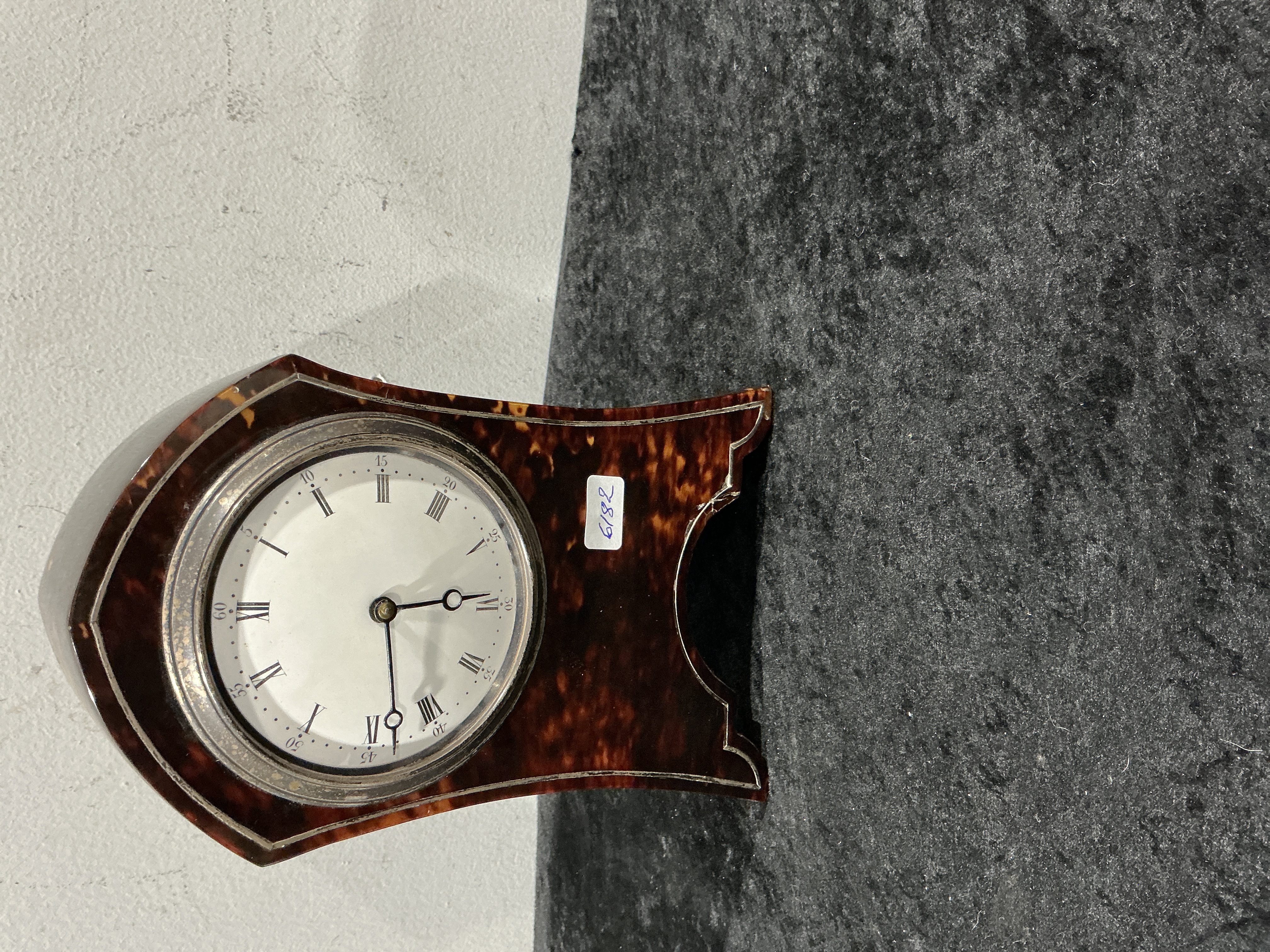 An English tortoiseshell and silver strung balloon mantel clock featuring a waisted case. The exterior is finished in tortoiseshell veneer with inlaid silver stringing. The circular white dial displays black Roman numerals for hours and Arabic numerals for minutes, set behind a polished metal bezel. The reverse contains a brass movement accessible through a hinged white metal cover. A small inventory label with the handwritten number 6182 is affixed to the front casing.