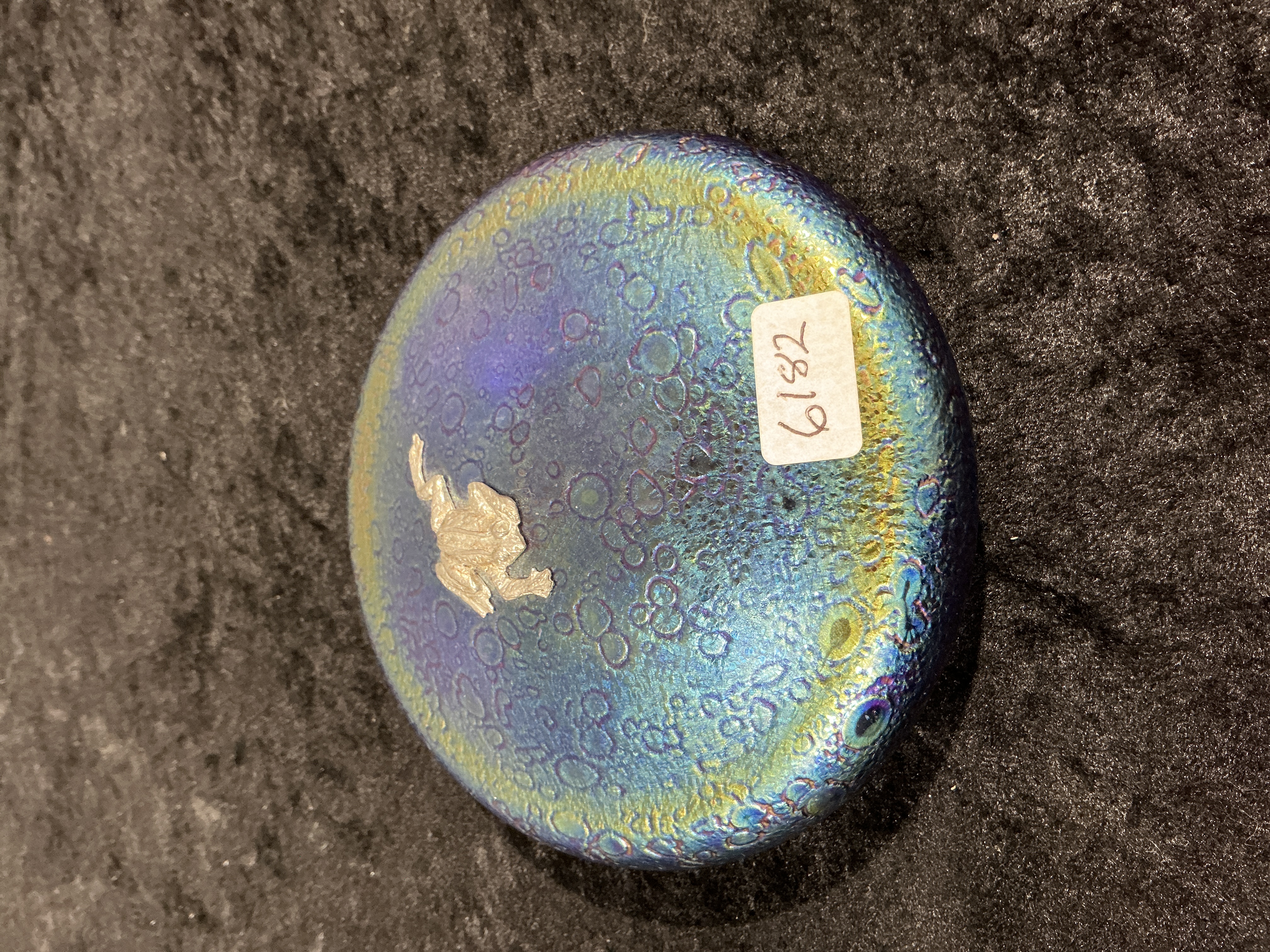 A Heron glass paper weight of compressed circular form, featuring an iridescent finish with a textured, crater-like surface in shades of blue, green, and purple. The piece is decorated with an applied metallic figure of a frog on the upper surface. The polished underside is etched with heron glass