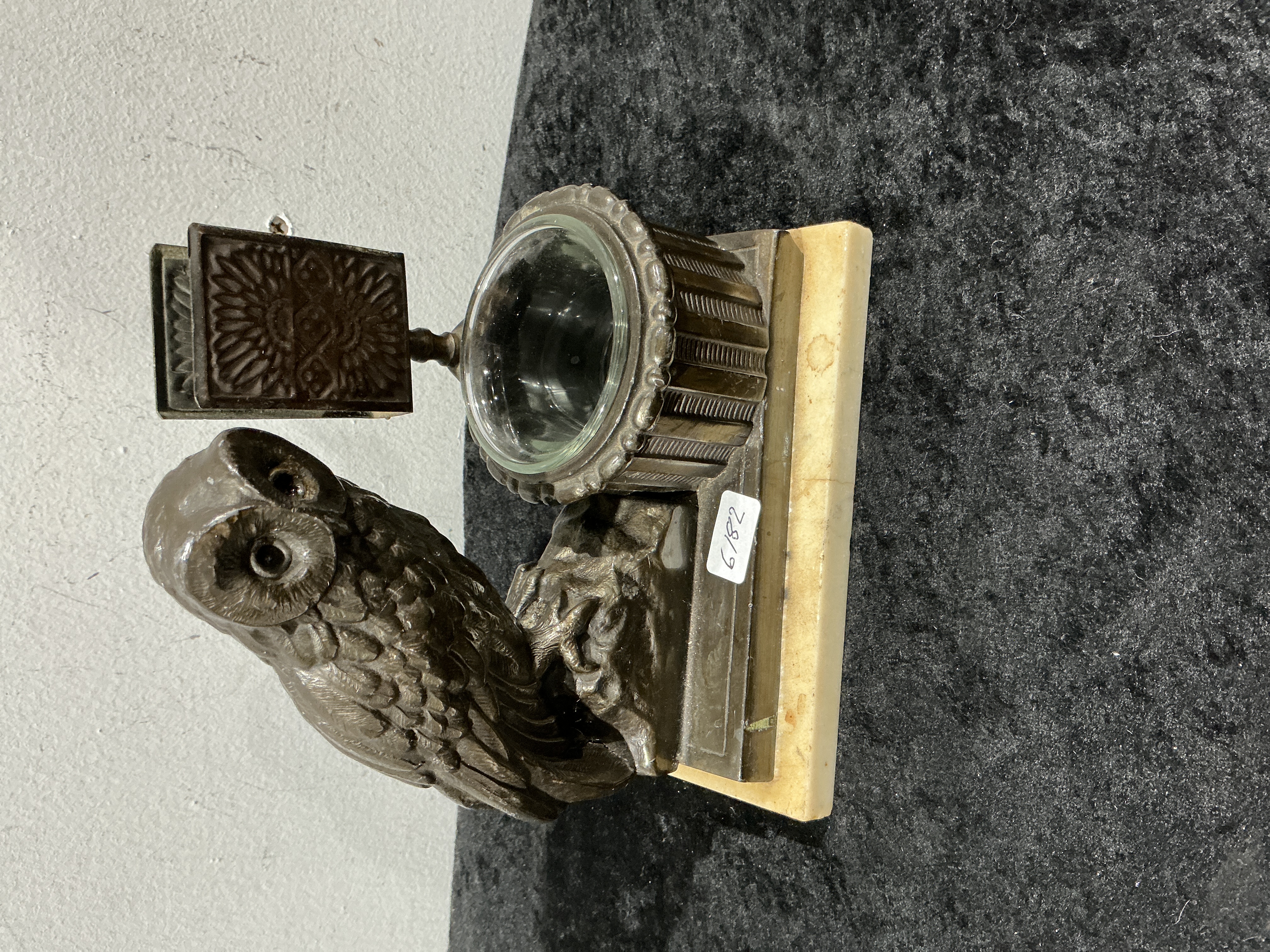This desk stand features a figural cast metal owl mounted alongside a circular inkwell on a rectangular stone base. The metal components are finished in a dark bronze-toned patina and include a detailed owl figure and a fluted inkwell housing. The inkwell contains a clear glass insert and is fitted with a hinged lid or clip featuring an embossed foliate pattern. The base is constructed from a light-colored, polished stone, possibly onyx or alabaster. A white adhesive label with the handwritten number 6182 is affixed to the metal frame.