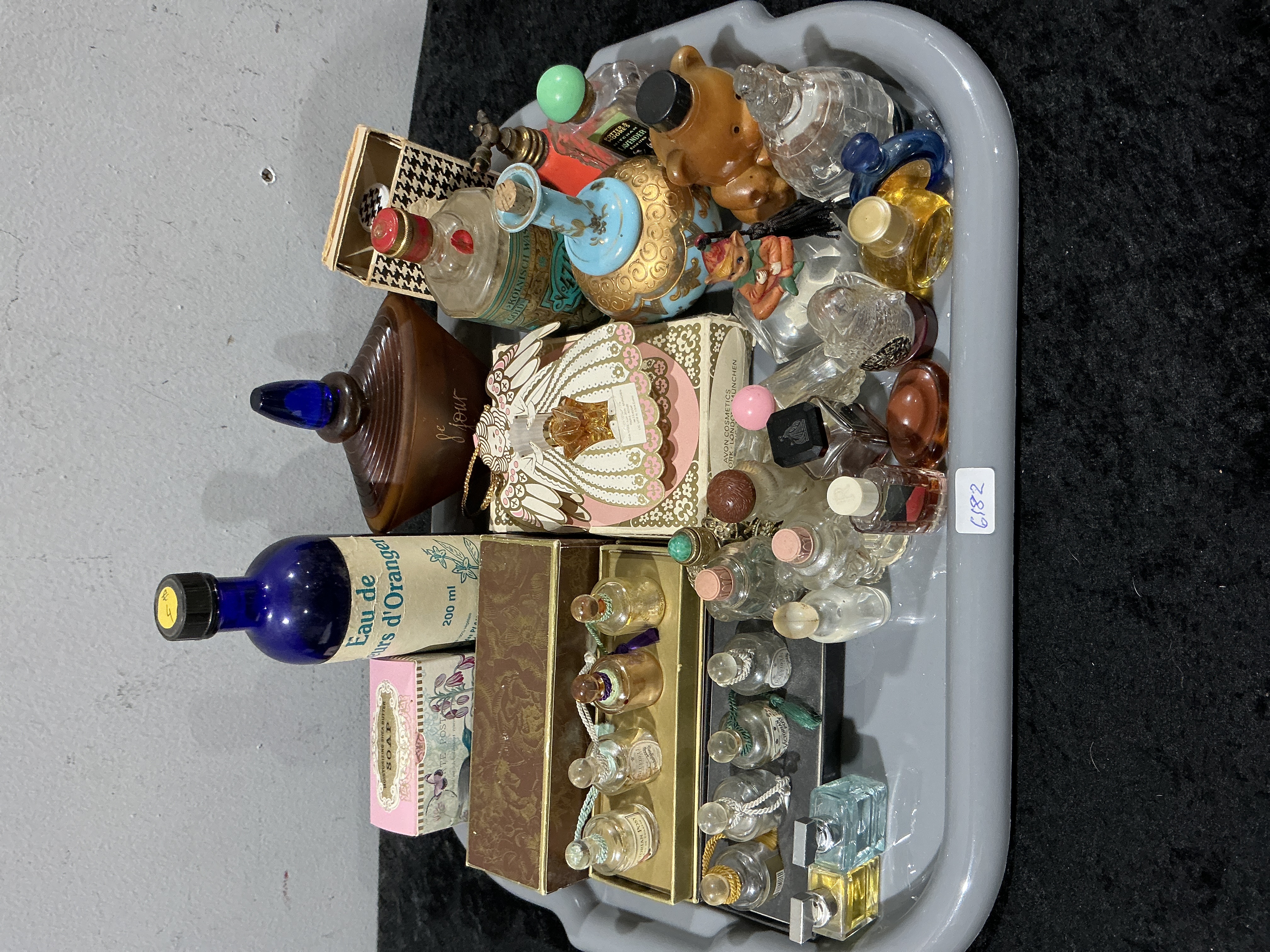 This collection consists of an assortment of vintage fragrance containers and vanity accessories, featuring a significant representation of Avon products as identified by market consensus. The group includes various glass bottles in cobalt blue, amber, clear, and frosted finishes. Notable pieces include a large cobalt blue bottle labeled Eau de Fleurs d’Oranger (200 ml), a gold-toned presentation box containing multiple miniature glass vials, and items bearing the 4711 brand. Several bottles are molded into decorative forms, including animal figures and an oil lamp style. The lot includes original cardboard packaging, such as a houndstooth-patterned box and a decorative pink and white angel-themed box. Materials comprise glass, plastic, and printed cardboard.