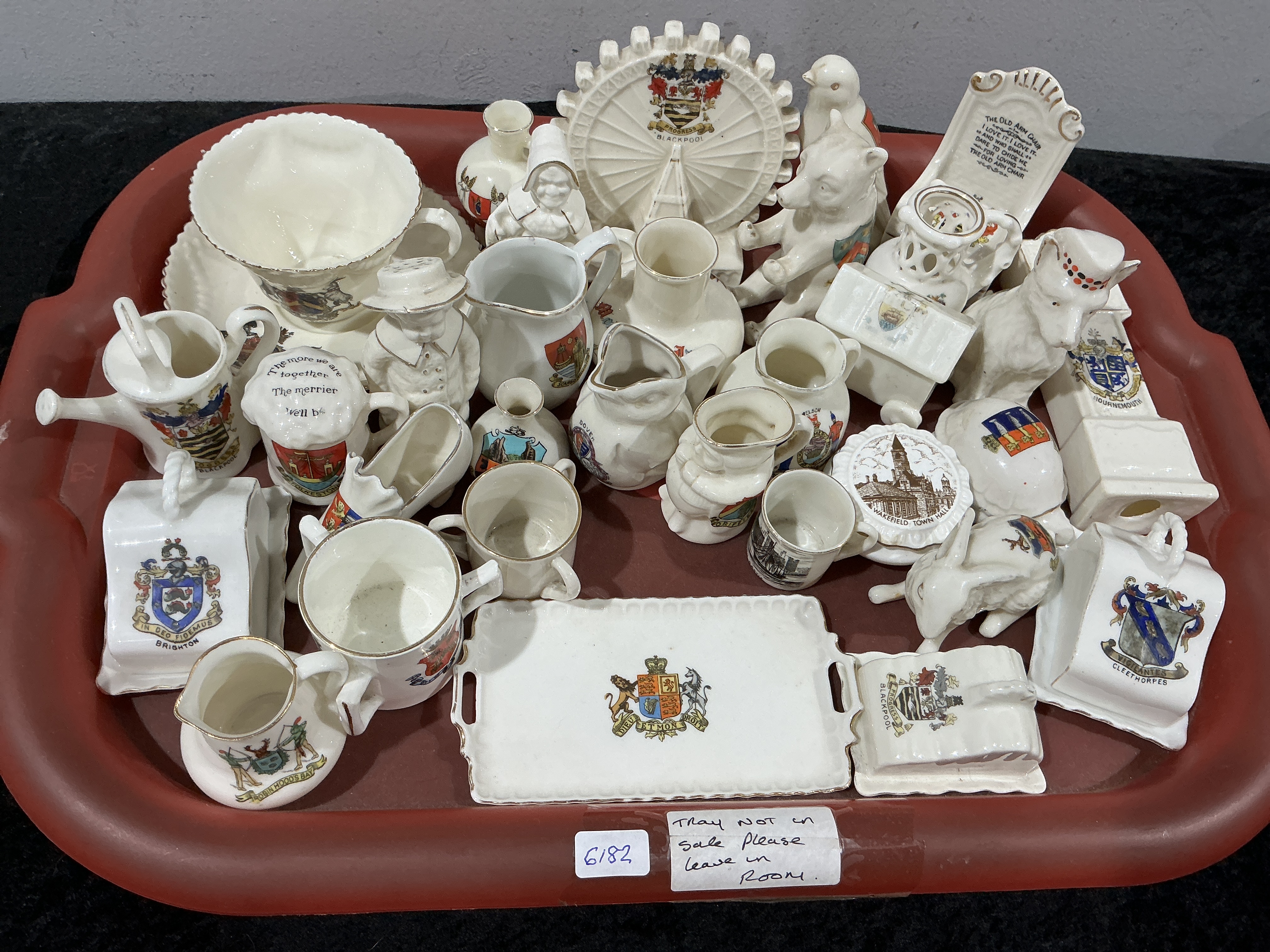 A collection of heraldic souvenir china, identified as crested ware and Goss china, dating from the early 20th century. The group comprises various miniature glazed white ceramic items in forms including jugs, teapots, vases, figurines, and architectural models. Each piece features polychrome transfer-printed coats of arms representing various British towns and municipalities, such as Blackpool, Brighton, Bournemouth, Cleethorpes, and Robin Hood’s Bay. Specific items include a miniature Blackpool Big Wheel, a Wakefield Town Hall commemorative piece, and a rectangular tray bearing the Royal Coat of Arms with the motto Dieu et mon Droit. Many pieces are accented with gilt rims. The red plastic display tray is not included in the lot.