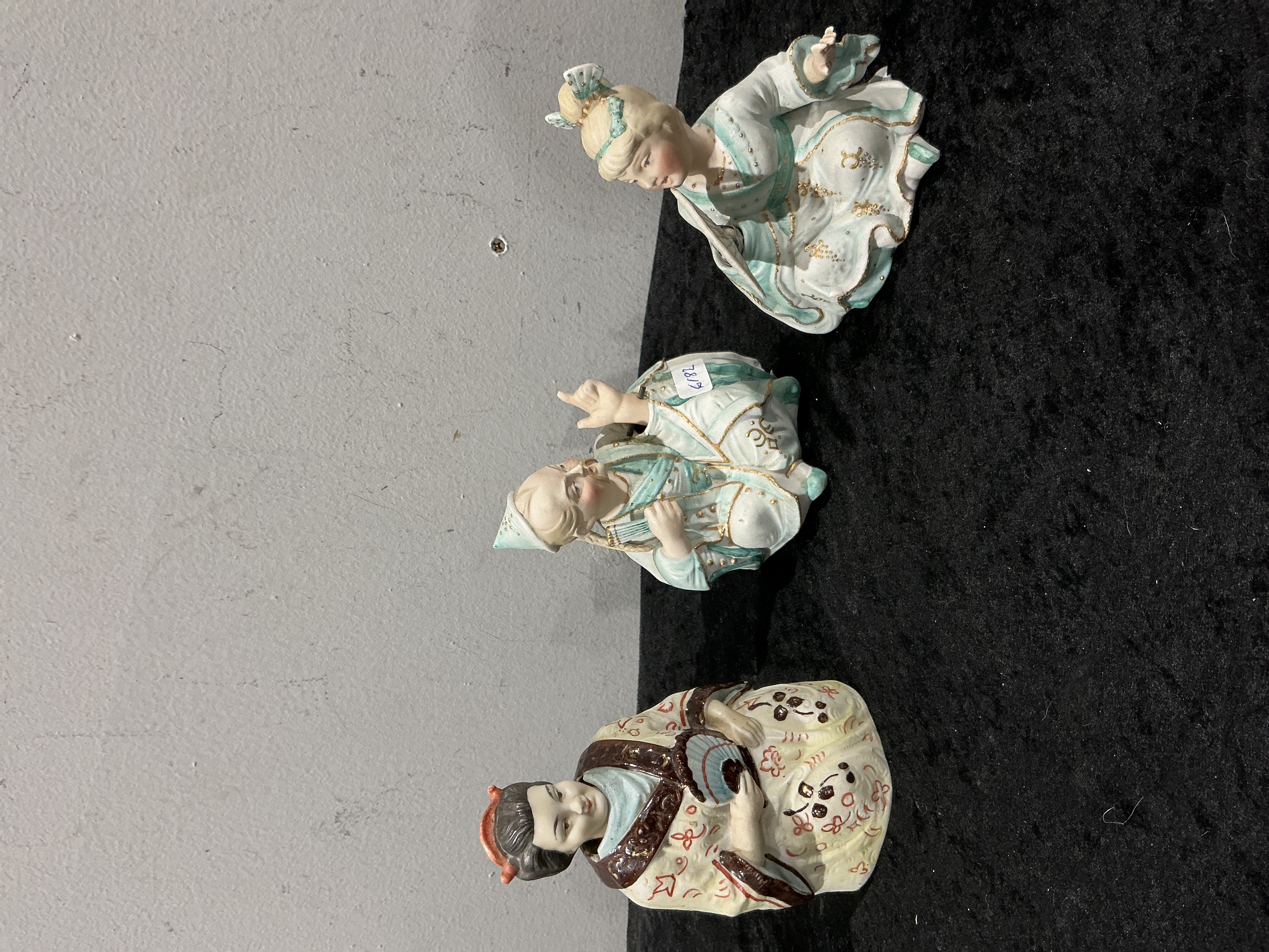 A trio of German bisque porcelain hand bells fashioned as seated Chinoiserie-style figurines. The group includes two figures in pale blue and white robes with gilded highlights and a third figure in a cream-colored robe with floral patterns and dark brown trim. Each item is constructed from hollow bisque porcelain with a matte finish on the interior, housing a functional clapper. The exterior surfaces feature hand-painted polychrome enamel decoration and gold-tone accents. One figurine bears a small adhesive label marked 6182.