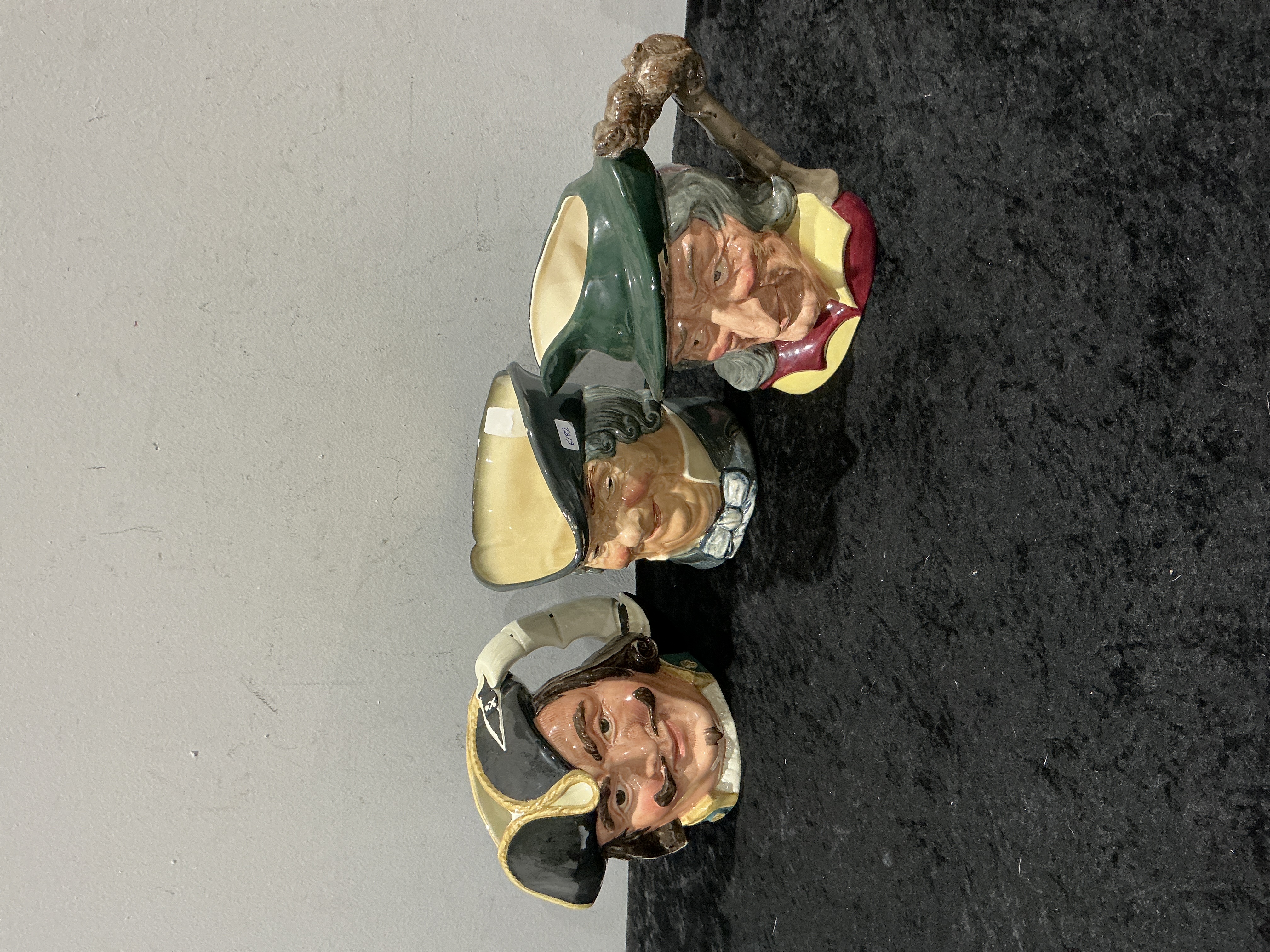 A trio of Royal Doulton glazed ceramic character jugs produced in England. The collection includes the Pied Piper, Capt Henry Morgan, and Mine Host models. The Pied Piper jug, D6403, copyright 1953, is modeled with a pipe-form handle. The Capt Henry Morgan jug, D6467, copyright 1957, features a handle shaped as a treasure chest. The Mine Host jug is depicted in a dark tricorn hat with a gray wig. All pieces are hand-painted and marked on the base with the Royal Doulton lion and crown backstamp, model titles, and registration numbers.