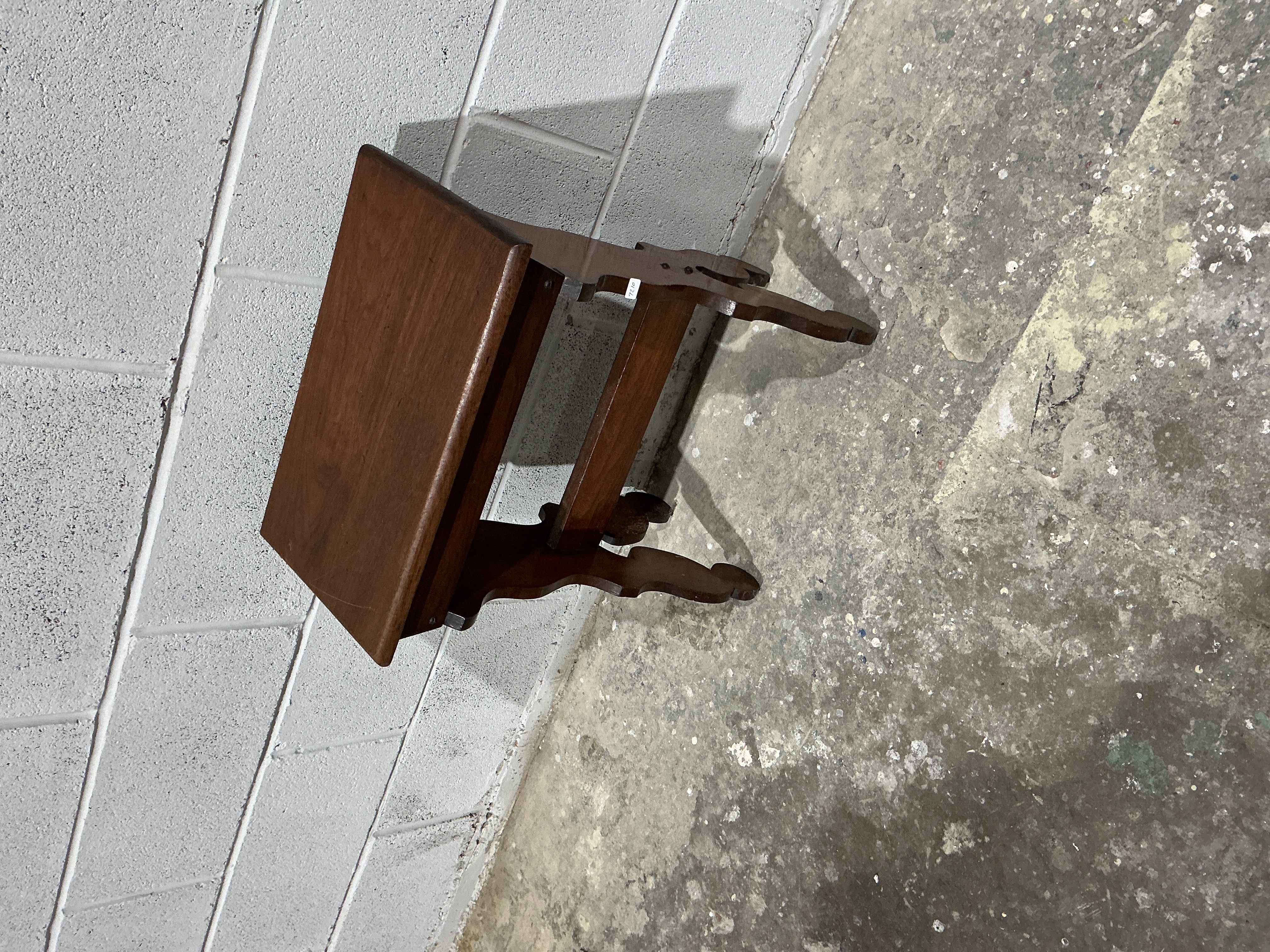 A single hardwood side table or plant stand, likely dating to the early 20th century. The piece features a rectangular top over a simple apron. The four legs exhibit a subtle curve, terminating in a simple foot, and are connected by a central, shaped stretcher bar. The wood is finished in a dark reddish-brown stain. The overall style is utilitarian with minimal decorative carving elements. An indistinct white inventory or lot sticker is visible on the interior frame near the top of the front left leg.