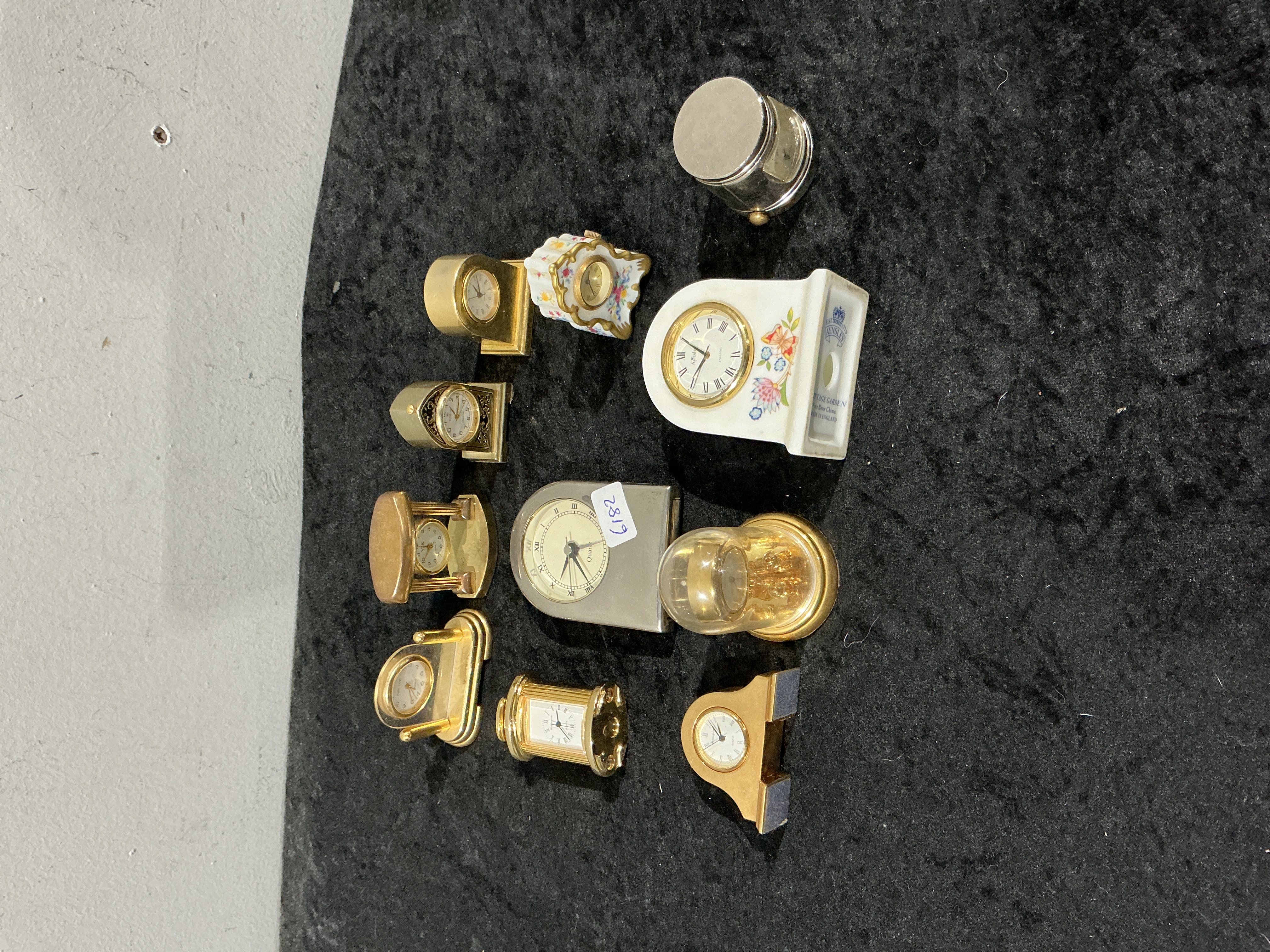 An assortment of miniature and desk clocks featuring quartz movements in various styles and materials. The collection includes a white ceramic arched clock in the Cottage Garden pattern by Aynsley, marked Fine Bone China, Made in England. Other pieces include brass-toned and silver-toned metal clocks in forms such as miniature carriage clocks, anniversary-style clocks with clear domes, and contemporary arched mantel designs. Several items correspond to the Collezio brand, typically featuring brass-toned finishes and Japanese quartz movements. The clock faces display a mix of Roman and Arabic numerals. One silver-toned arched clock retains a white identification sticker.