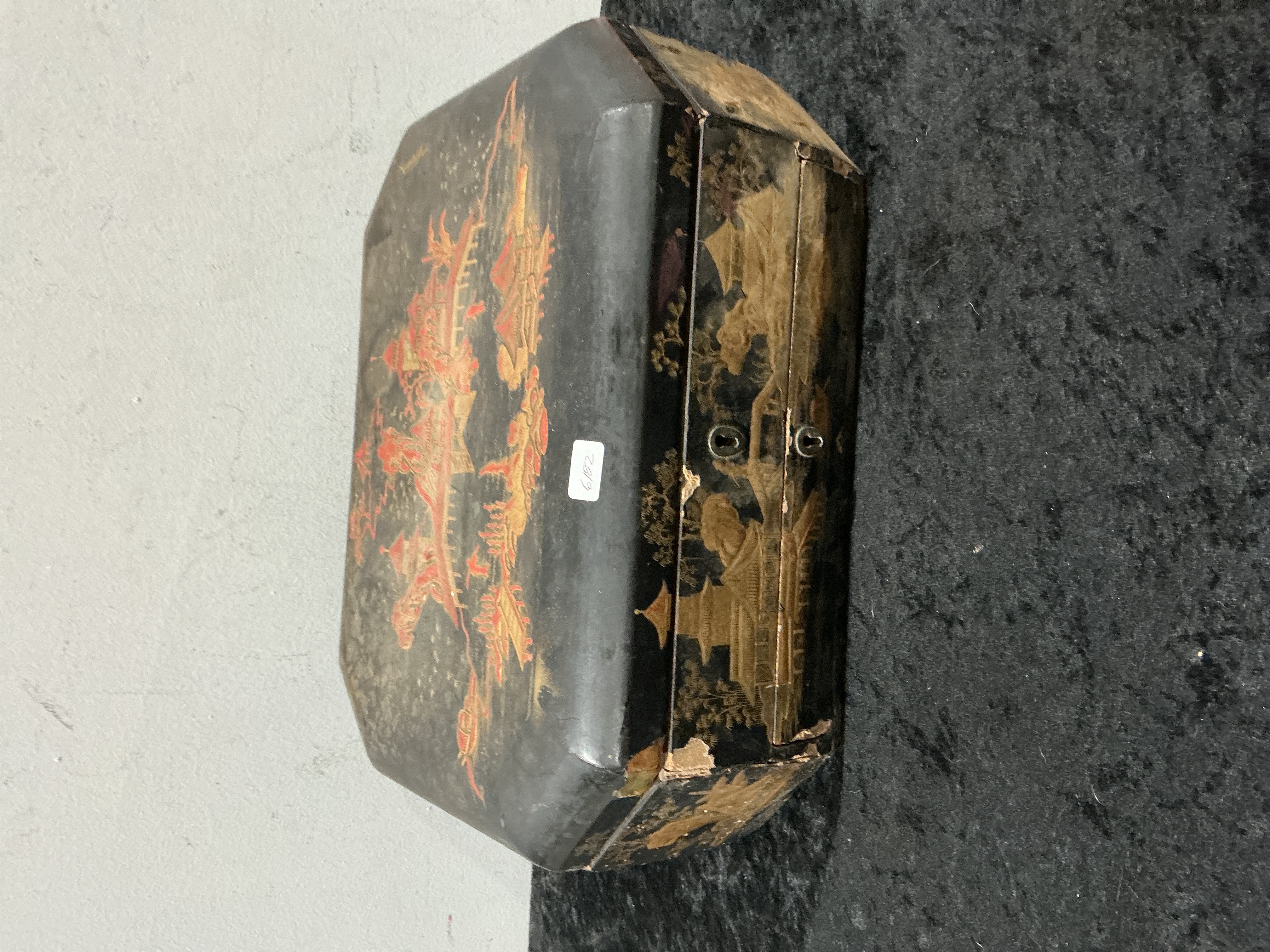 This 19th-century oriental box is a Chinese export-style sewing or work box of octagonal form. The exterior is finished in black lacquer and decorated in the Chinoiserie taste with gilt and red scenic landscapes featuring pagodas and figures. The hinged lid opens to a fitted interior containing multiple compartments, several with matching decorated lids. A single pull-out drawer is located at the base. The lot includes a collection of miscellaneous sewing-related implements and accessories. This item needs restoration to address surface and structural degradation.