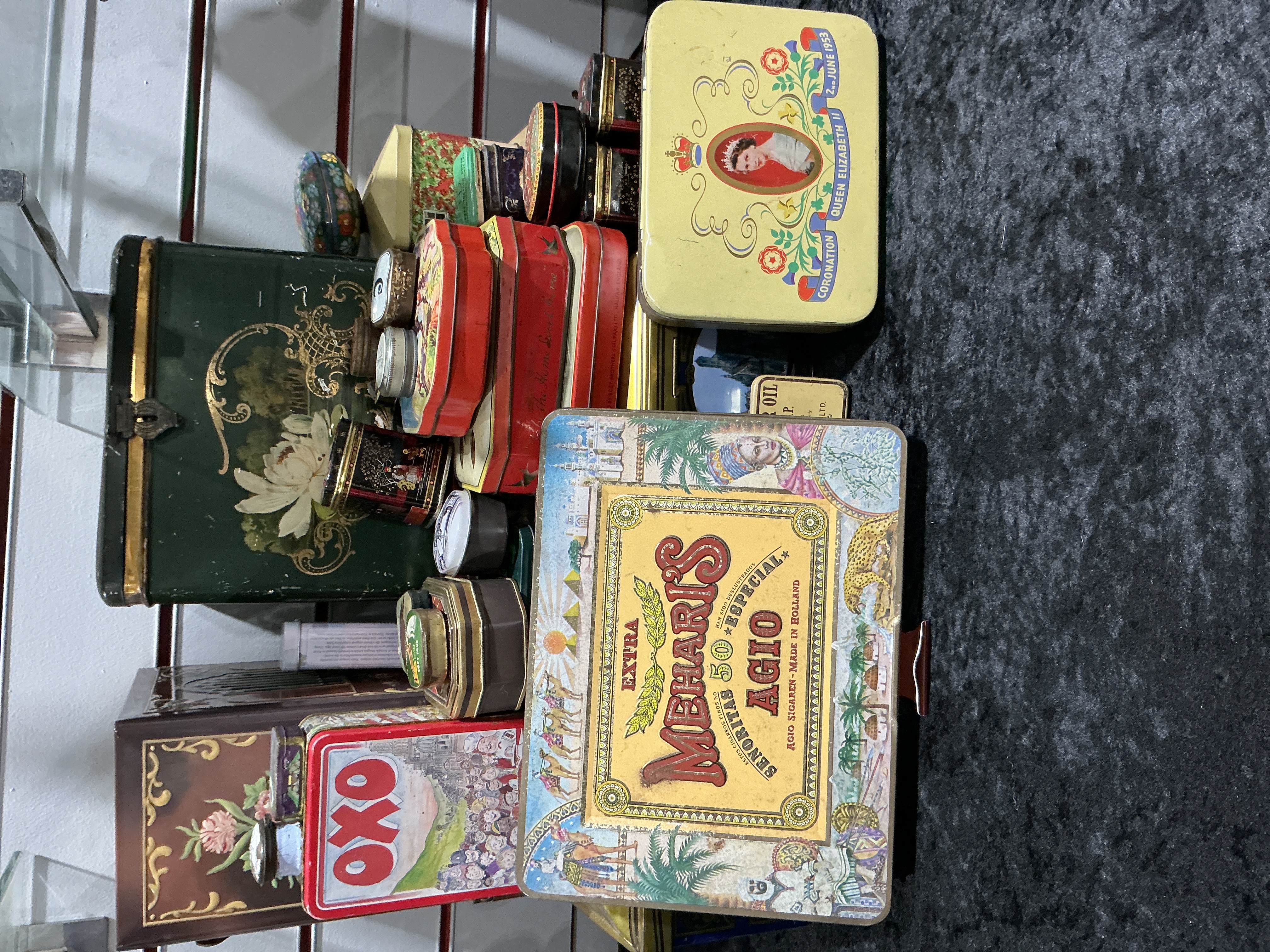 This collection consists of an assortment of vintage lithographed metal tins in various shapes and sizes. Featured items include a large flat rectangular tin for Agio Mehari’s 50 Senoritas Especial cigars, produced in Holland, which displays a multi-colored illustrative design with tropical and Middle Eastern motifs. The group contains a yellow commemorative tin for the Coronation of Queen Elizabeth II dated June 2nd, 1953, featuring a central portrait of the monarch. Also included is a red and white OXO brand tin and a large dark green tin decorated with a water lily design and gold-tone scrolling. The remainder of the lot comprises multiple smaller tins in rectangular, round, and hexagonal forms with various decorative patterns and branding.