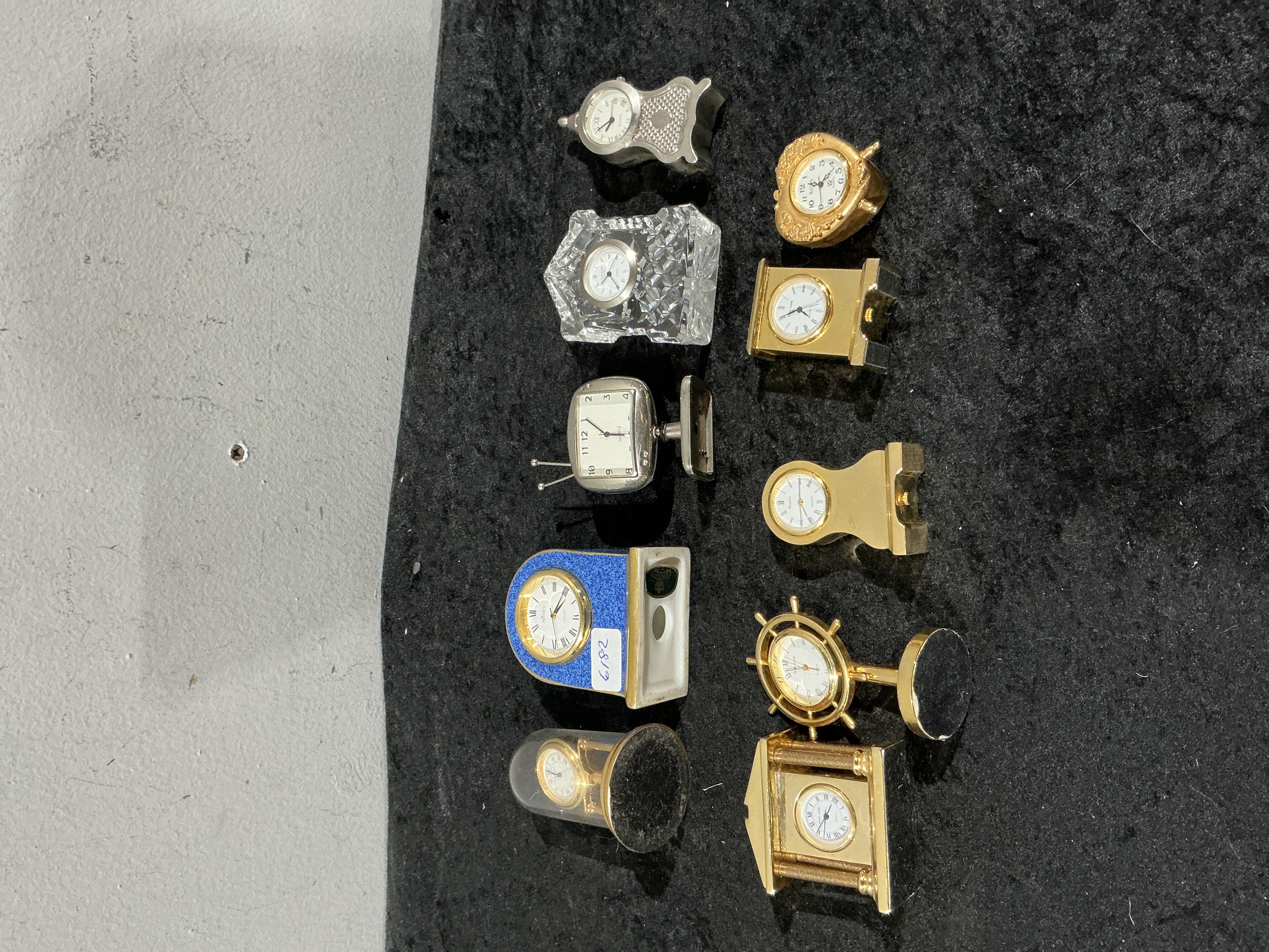 An assortment of miniature novelty desk clocks in various decorative styles and materials. The group includes designs such as a gold-tone ship’s wheel, a heart-shaped case with scrolled detailing, a television-inspired clock with antennae, and a cut-crystal arched clock. Other models feature gold-tone and silver-tone finishes, including one with a blue speckled frame. Most clocks are equipped with white dials featuring either Roman or Arabic numerals and are marked Quartz. One blue-framed clock bears a small adhesive label marked 6/82. The collection primarily consists of battery-operated quartz movements housed in metal and glass cases.