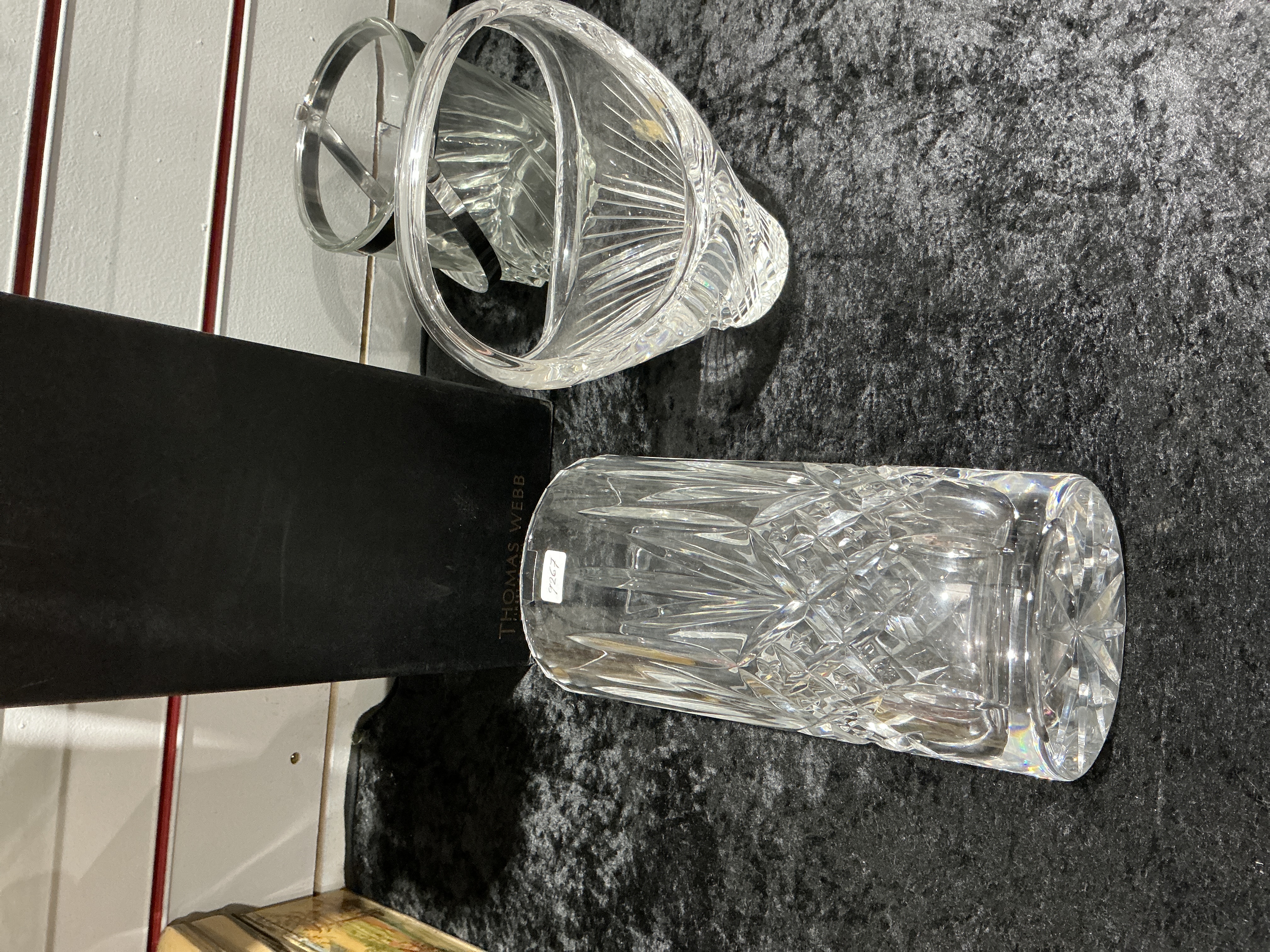 Two lead crystal objects manufactured by Thomas Webb, consisting of a cylindrical vase and a basket-form bowl with an integrated handle. Both pieces feature hand-cut geometric patterns, including diamond-cut cross-hatching and deep vertical fluting. The vase retains an original black and gold manufacturer label for Thomas Webb and a white inventory sticker marked 9267. The lot is accompanied by a black presentation box bearing the Thomas Webb brand name in gold lettering.