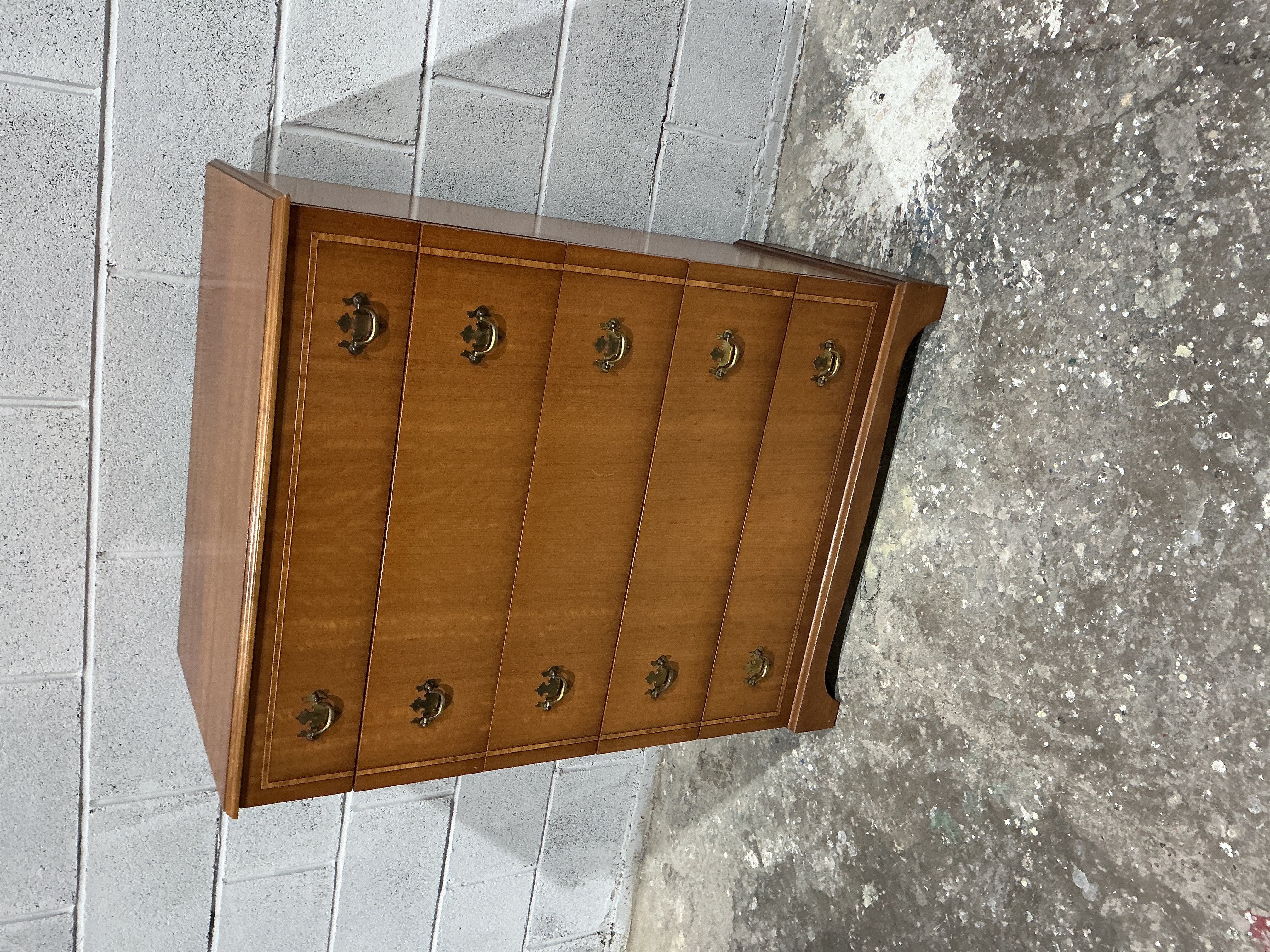A five-drawer tall chest of drawers executed in the Neoclassical or Federal style, consistent with designs produced by Baker Furniture. The chest is constructed of a medium-toned hardwood, likely cherry or maple, exhibiting a high-gloss lacquered finish. The rectangular case features five full-width, horizontally stacked drawers, each detailed with delicate string inlay banding surrounding the perimeter. The drawers are fitted with ten brass-toned bail handles mounted on ornate, shaped backplates. The chest rests on a shaped bracket base.