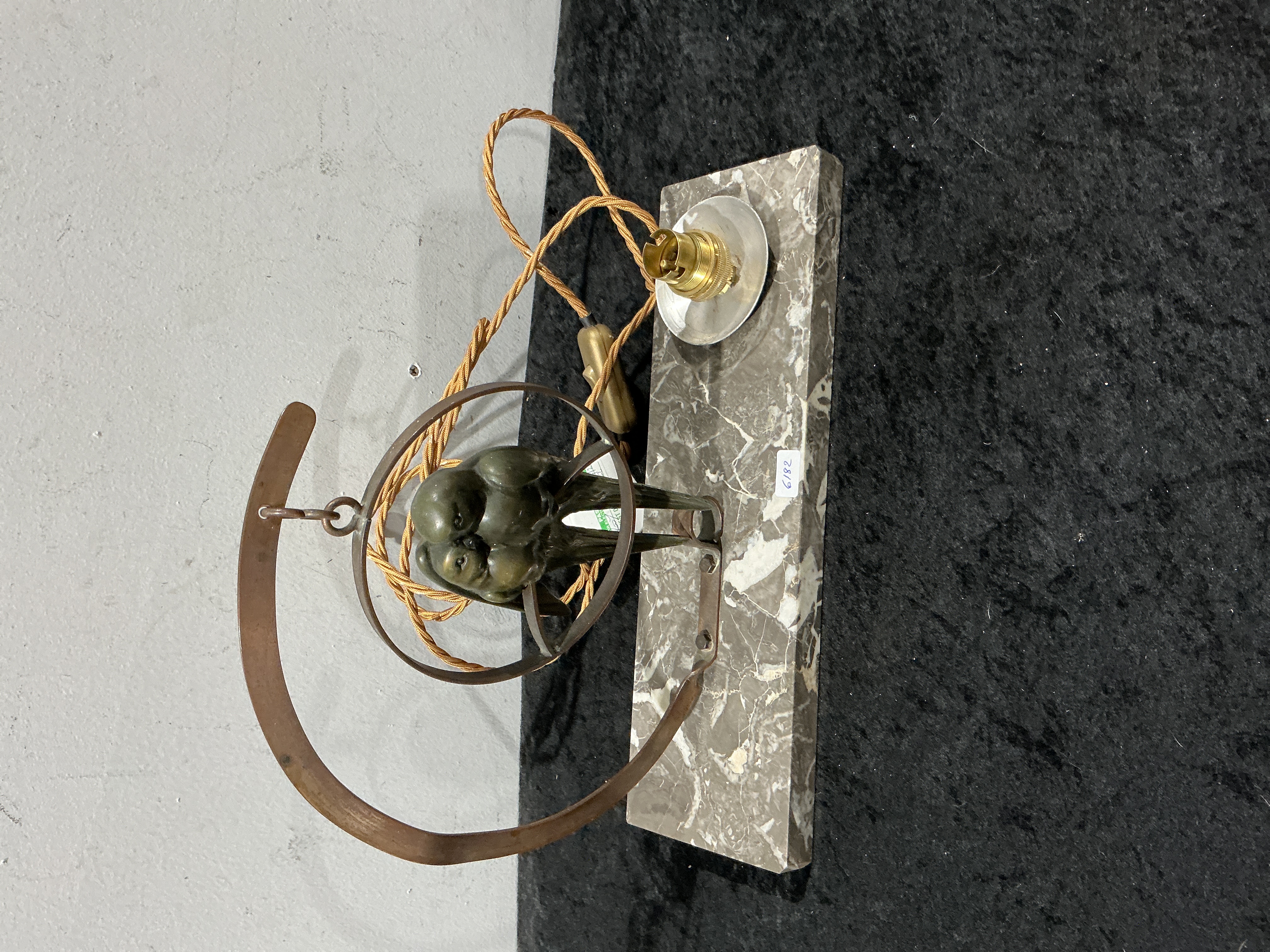 This table lamp base features a Jumping Through Hoops sculpture, a design associated with Sagebrook Home. The central decorative element consists of a bronze-patinated metal sculpture depicting two stylized figures positioned within a circular hoop, which is attached to a curved metal support arm. The entire assembly is mounted upon a rectangular, variegated marble plinth. The lamp is equipped with a brass bulb socket and a brown twisted fabric-covered electrical cable. A small white adhesive label with the handwritten number 6182 is present on the marble base.