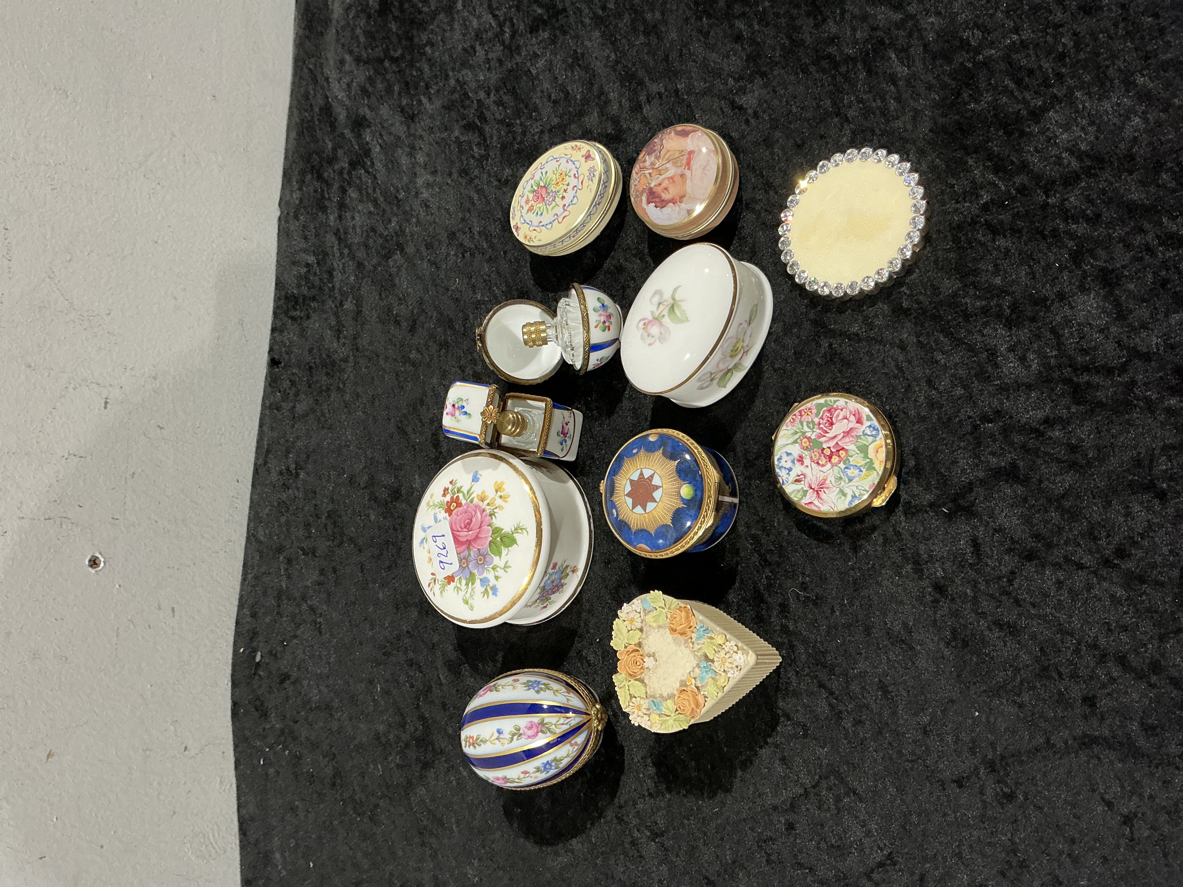An assortment of porcelain and ceramic decorative items comprising various trinket boxes and small scent bottles. The collection includes pieces in round, oval, heart, and egg forms. Decorative motifs include floral patterns, a celestial star design, and romantic vignettes. Several items feature gilded metal rims with hinged closures. One box includes a lid accented with a perimeter of clear rhinestones. Two scent bottles are present, including one square glass bottle with a gilded cap and one small bottle housed within a matching porcelain vessel. A handwritten adhesive tag marked 7269 is present on the lid of a larger circular floral box.