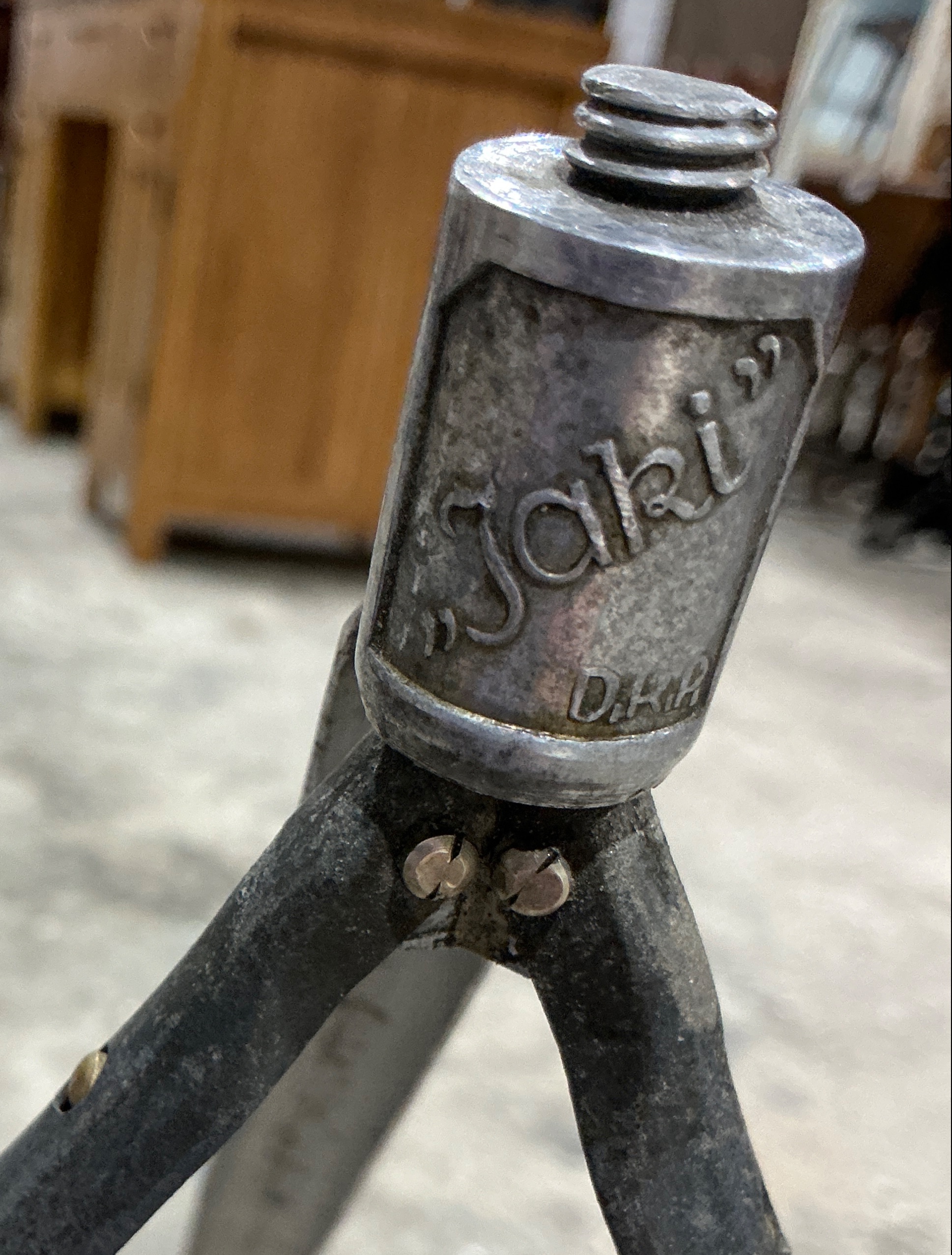 Two items comprising a German-manufactured metal tripod and a wooden walking cane. The tripod features a cylindrical metal head embossed with the brand name Jaki in a stylized font and the mark D.R.P. for Deutsches Reichspatent. The head is topped with a threaded screw mount and the unit is supported by three dark metal legs. The walking cane is constructed from turned wood with a tapered shaft and a black rubber ferrule at the tip.