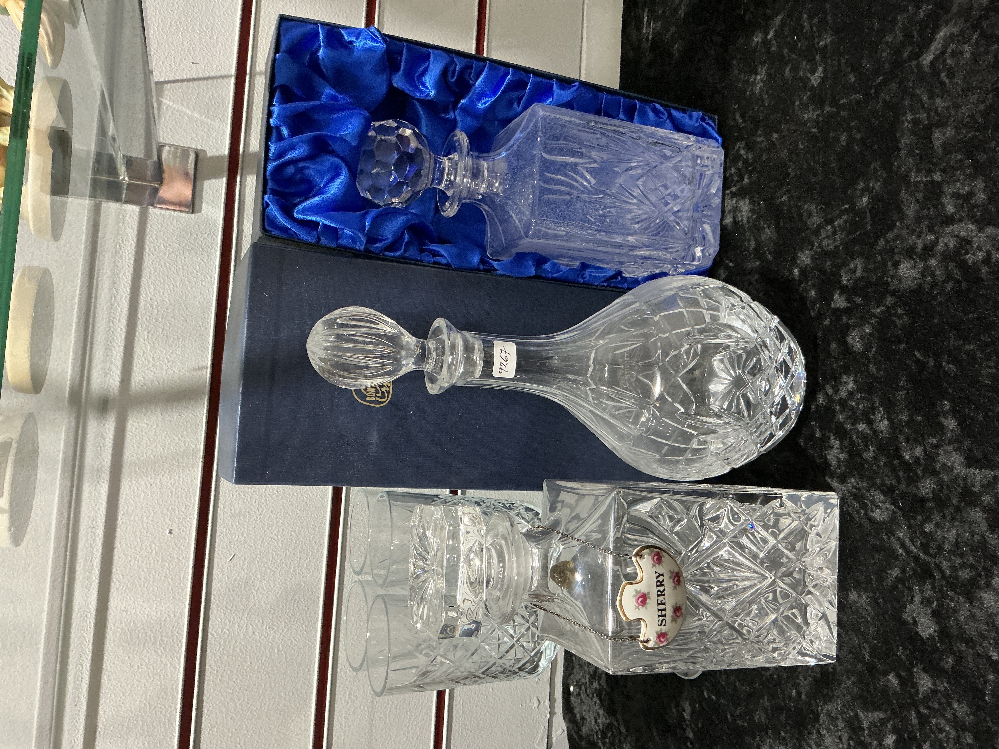 A collection of Bohemia cut lead crystal glassware featuring multiple decanters and coordinating drinking vessels. The set includes square-bodied decanters with multifaceted stoppers and a teardrop-shaped decanter with a reeded stopper. All pieces exhibit intricate hand-cut diamond and starburst patterns. Included is a ceramic bottle tag labeled SHERRY decorated with pink roses and several cylindrical glasses with matching cut-base details. The collection is accompanied by two blue presentation boxes, one featuring the Bohemia Crystal logo and a blue satin-lined interior.