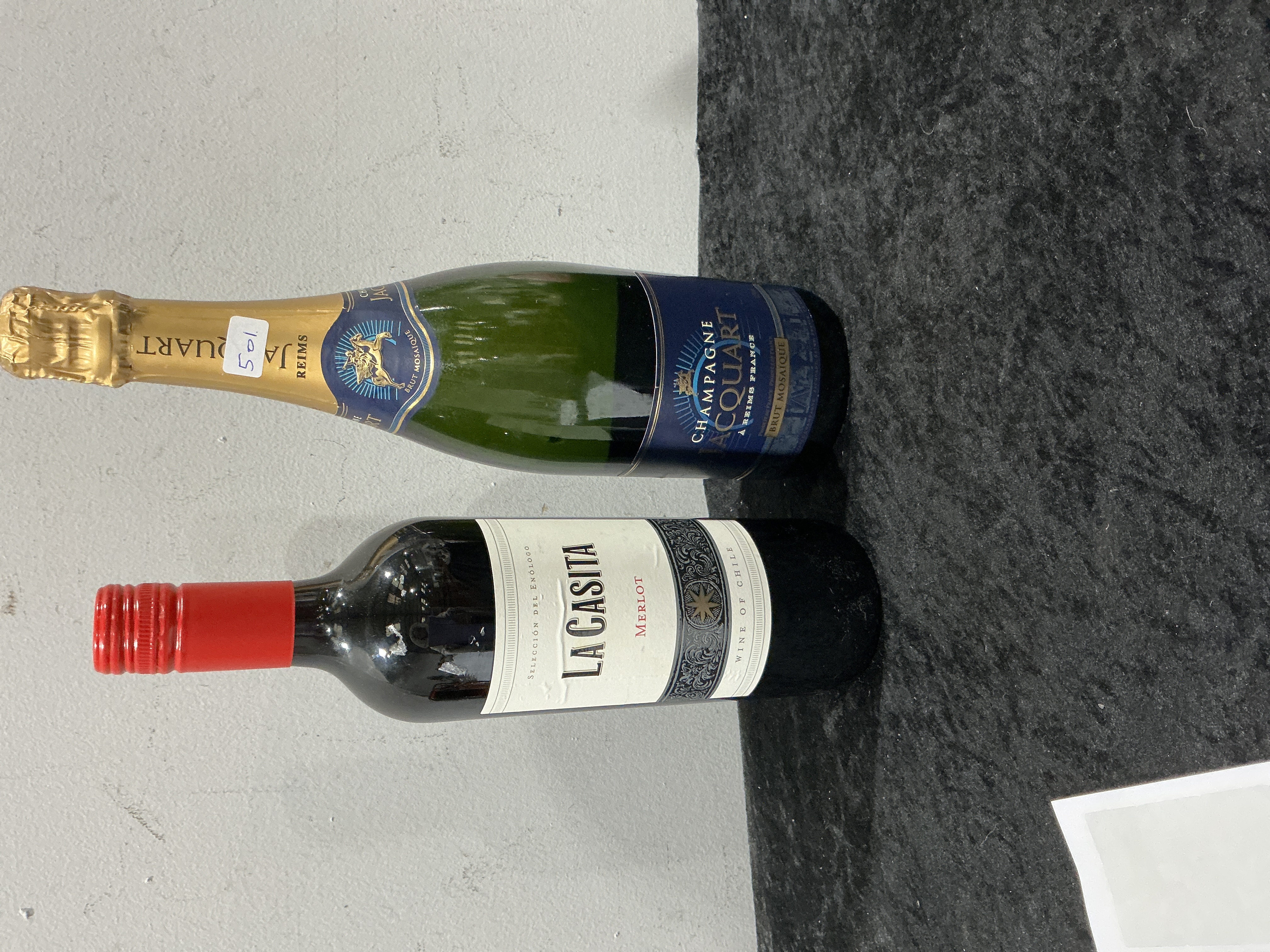 Two unopened bottles of alcoholic beverages. The first is a bottle of Champagne Jacquart Brut Mosaique from Reims, France. The bottle is constructed of green glass with a gold-toned foil seal and a blue and gold label featuring a winged mythological figure. A small white sticker with the handwritten number 501 is adhered to the neck foil. The second is a bottle of La Casita Merlot from Chile, labeled Seleccion del Enologo. The bottle is dark glass with a red screw-cap closure and an off-white label with black decorative filigree.