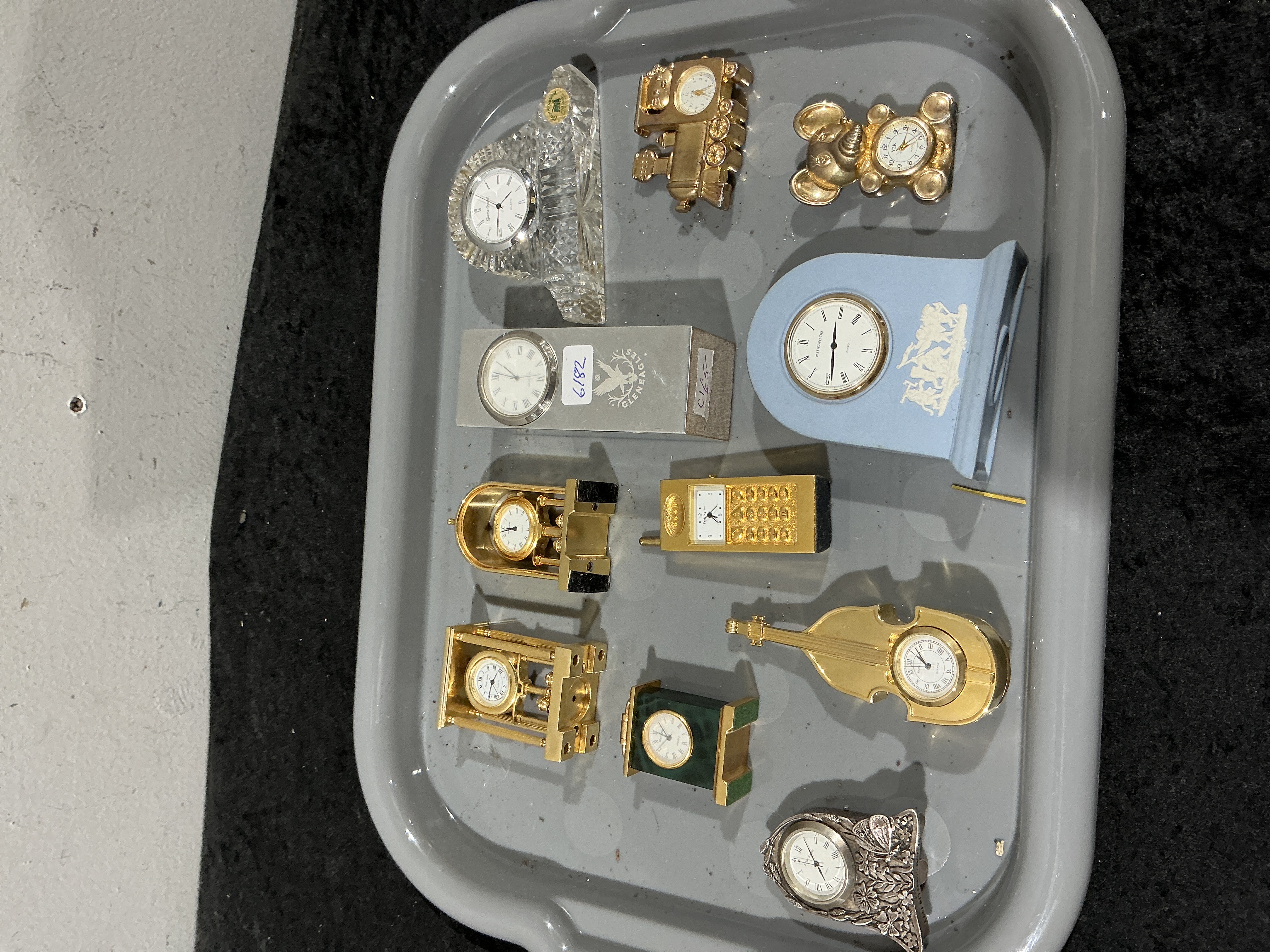An assortment of miniature novelty and desk clocks featuring quartz movements. The collection includes various forms such as a steam locomotive, a teddy bear, a cellular phone, a violin, and traditional carriage, mantel, and anniversary-style designs. Materials represented include gold-tone and silver-tone metal, faceted cut crystal, and a green stone-effect casing. One notable item is a blue jasperware arched clock featuring a white classical relief marked Wedgwood. Another item is presented in a silver-colored box with Gleneagles branding. The clock faces feature a variety of Roman and Arabic numerals.