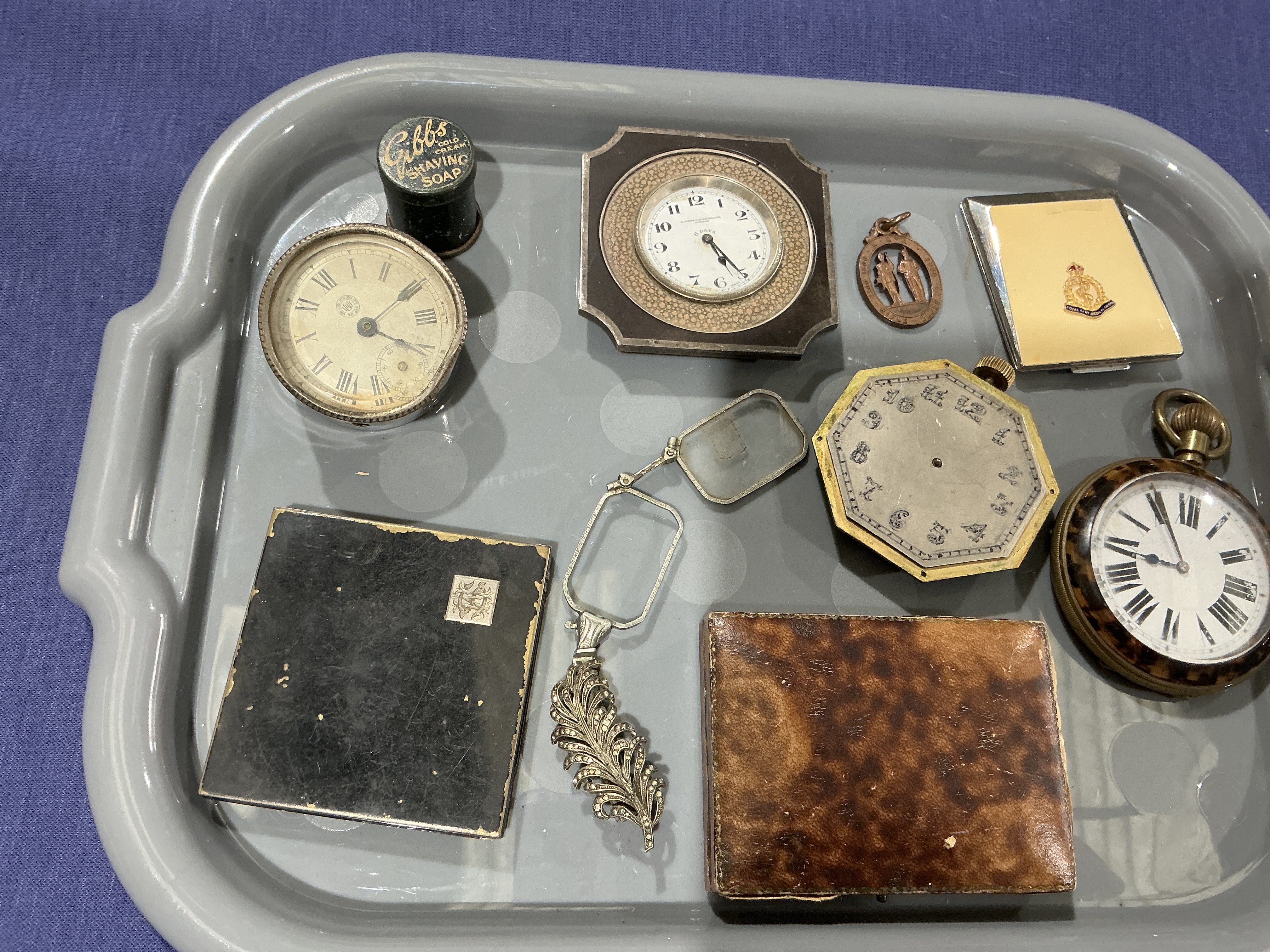 A collection of pocket watch and clock spares and repairs, featuring an assortment of timepieces and personal effects from the early to mid-20th century. The group includes a round brass-framed travel clock with a Roman numeral dial, an 8-day desk clock housed in a square frame, and a pocket watch with a faux-tortoiseshell case. Also present is an octagonal clock component. The collection further contains vanity and utility items such as a small cylindrical Gibbs Cold Cream Shaving Soap container, a rectangular case with a tortoiseshell-effect finish, and a cream-colored case displaying the Royal Army Medical Corps insignia. Additional items include a pair of folding lorgnettes with an ornate leaf-shaped handle and a small bronze-toned oval medallion.