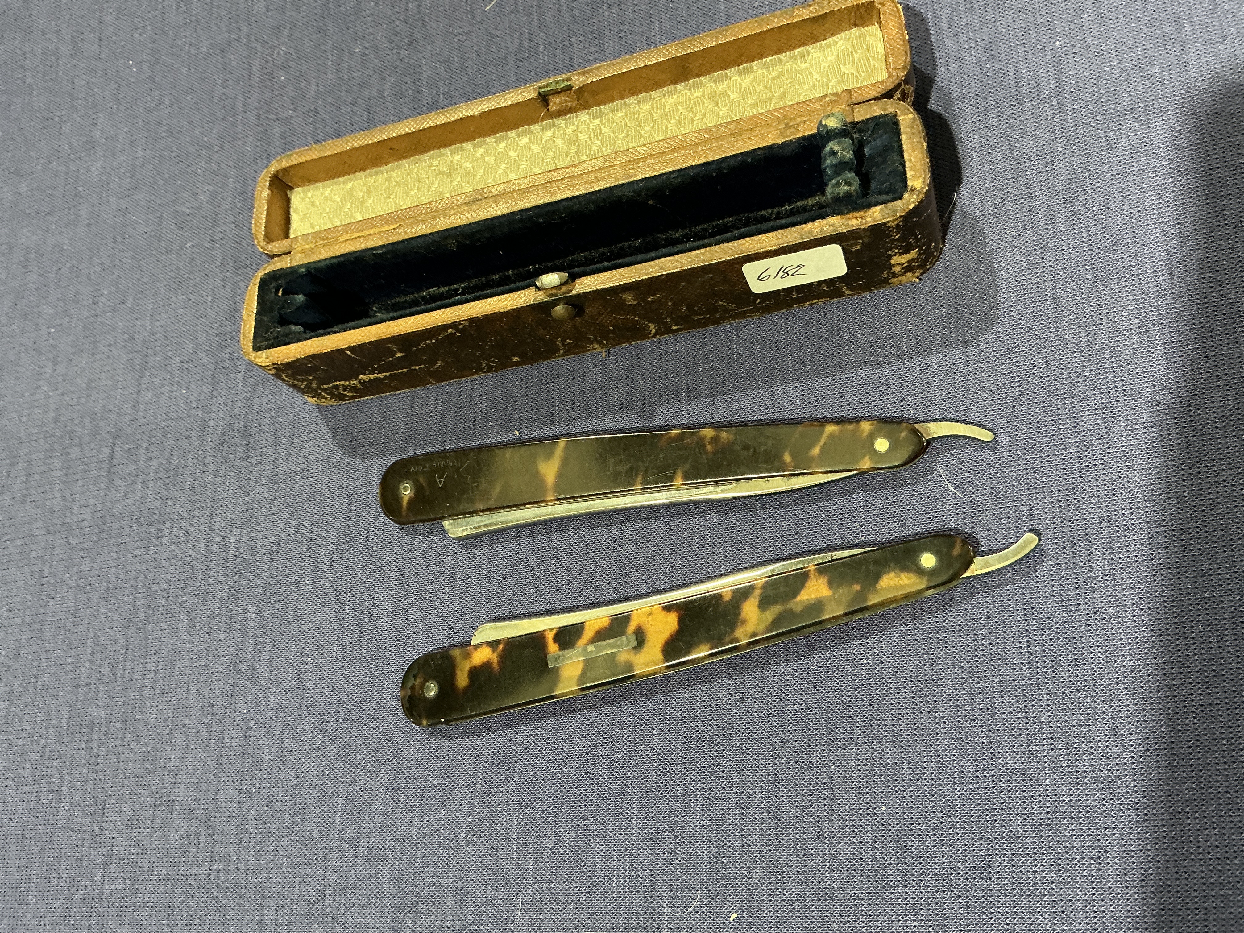 A pair of antique straight razors featuring folding steel blades and scales with a tortoiseshell pattern. One razor tang is stamped with the word FRANCE and other faint markings. One set of scales includes a small rectangular metallic inlay. The razors are housed in a fitted rectangular presentation case. The case features a brown textured exterior and opens to reveal a yellow patterned fabric lining on the lid and a dark, plush-lined interior base with slots designed to hold the razors.
