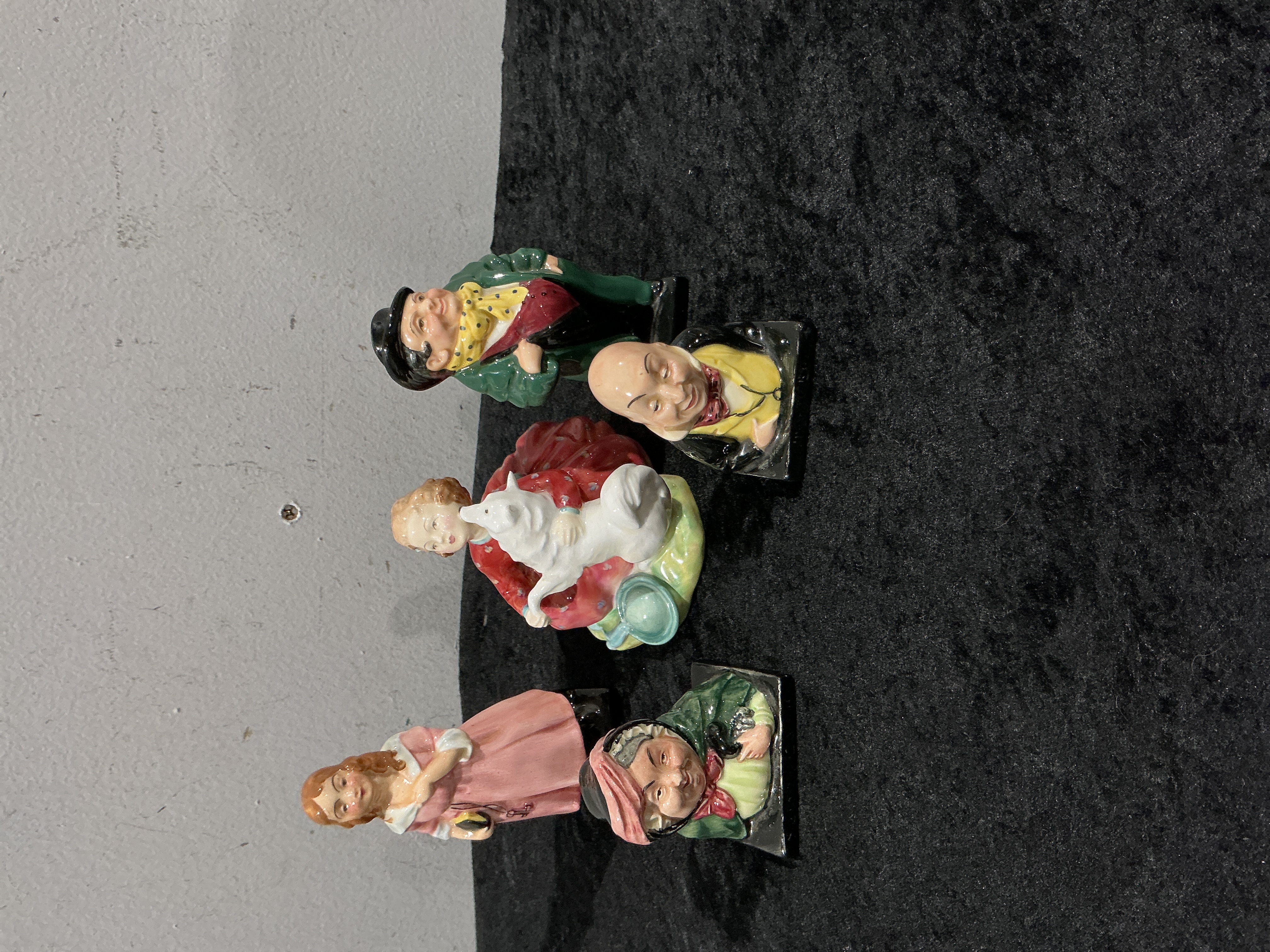 A collection of five Royal Doulton ceramic figures and character busts, executed in polychrome glazed earthenware. The collection consists of five royal doulton figures, including three standing figures and two square-based character jug busts, primarily executed in the style of Dickensian characters. Specific identified figures include “Tony Weller,” “Little Nell,” and “Home Again.” The figures are molded and painted with detailed features, utilizing a vibrant color palette including green coats, red dresses, and yellow detailing. Markings visible on the inverted bases confirm the manufacturer as Doulton, Doulton & Co Ltd, or Royal Doulton, England.