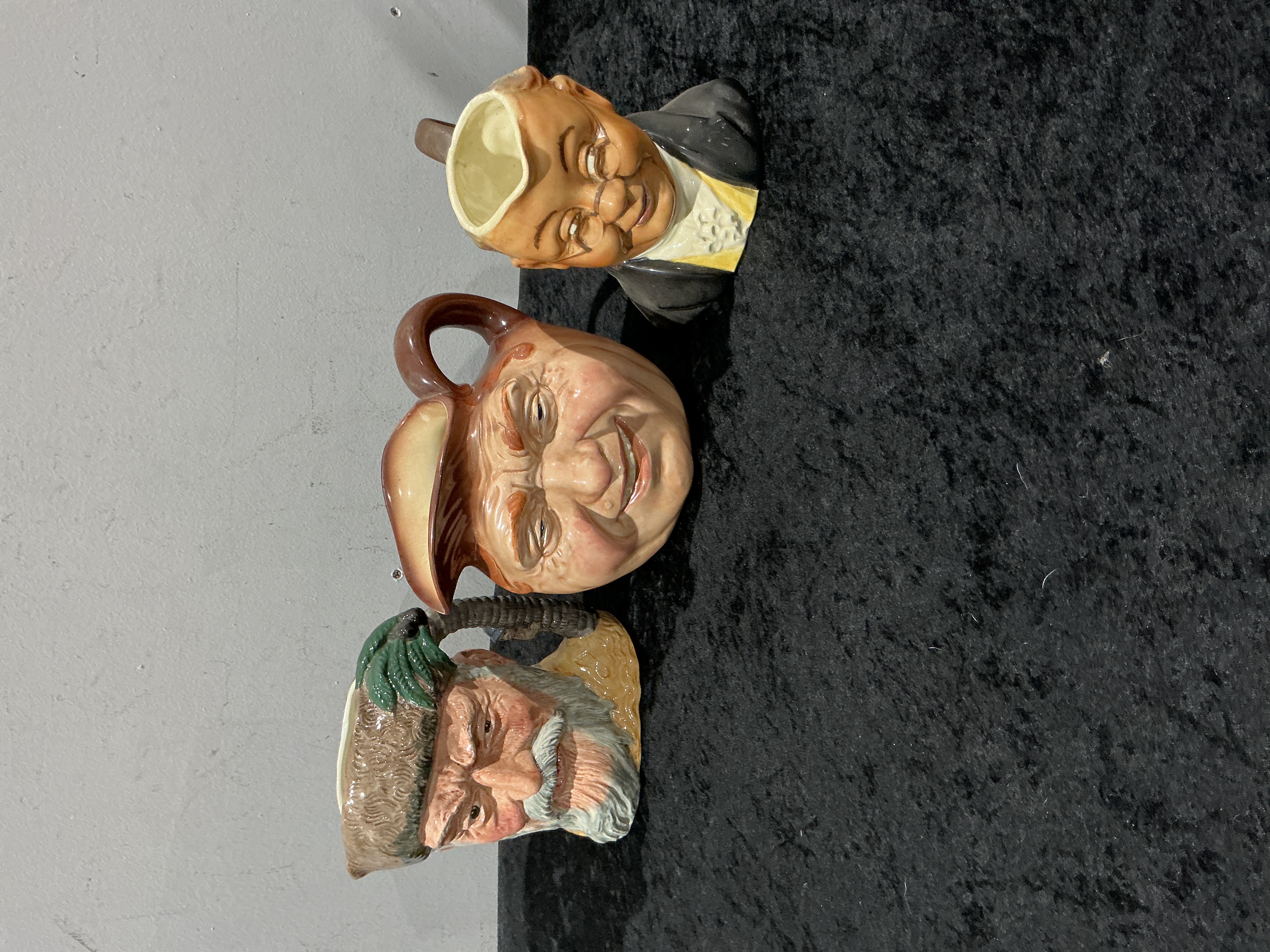A collection of three glazed earthenware character jugs, often categorized as Toby jugs, depicting stylized male portraits and figures. The jugs are modeled in full relief with highly detailed, hand-painted features, consistent with English manufacture. The lot includes the Royal Doulton “John Barleycorn” Large Character Jug, pattern number D5327, which depicts a ruddy-faced man wearing a brown cap. The base of this jug bears a clear Royal Doulton backstamp. A second jug, depicting a figure in a tuxedo with a yellow vest, is marked “PICKWICK” on the base, suggesting a connection to Charles Dickens’ literature. The third jug depicts a bearded man in a green hat. All three jugs exhibit vibrant coloration.