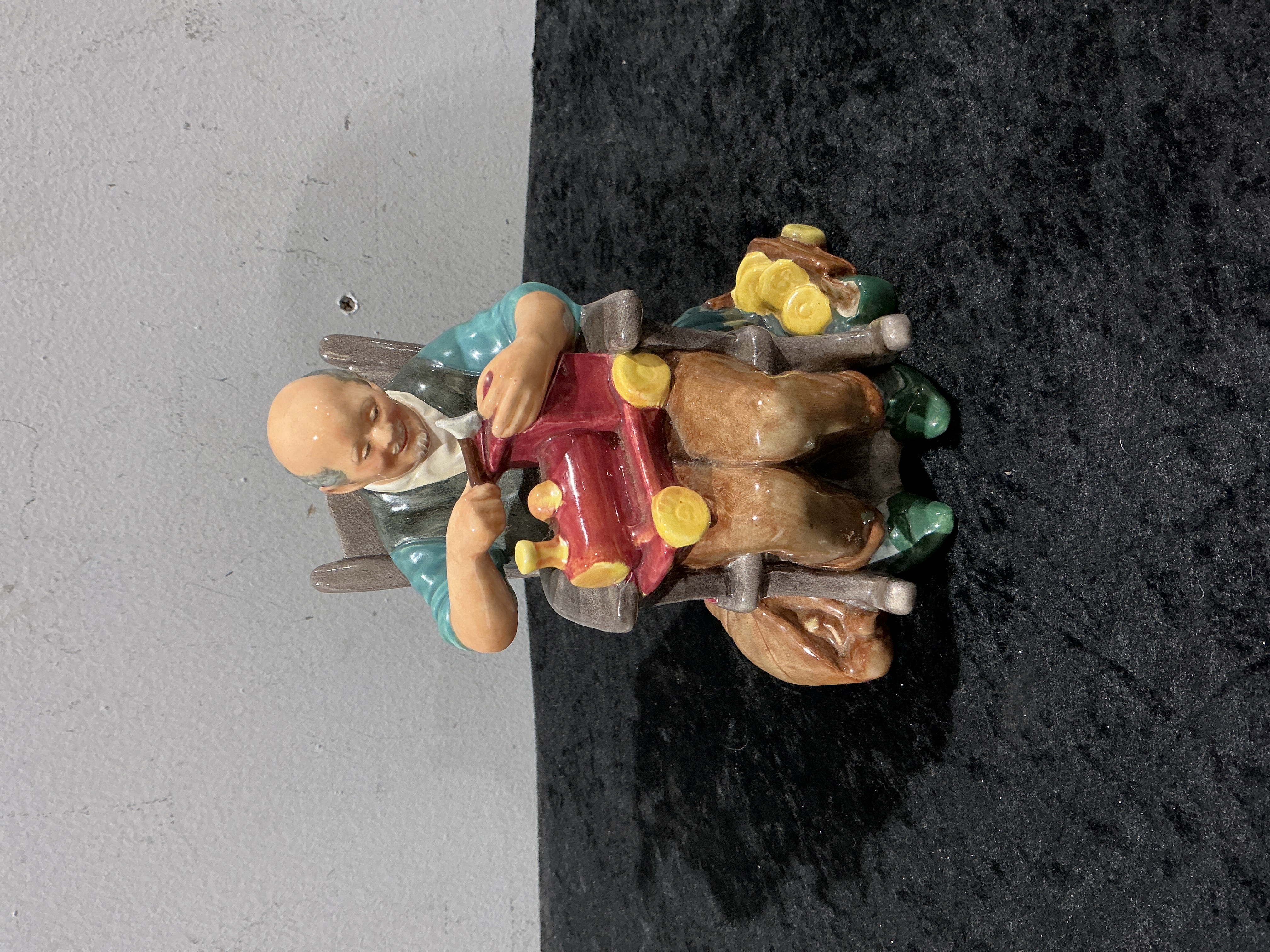 A single glazed ceramic figurine manufactured by Royal Doulton, titled “The Toymaker” (HN2250). The piece depicts a seated, smiling, bald man, dressed in a green and teal shirt over a dark vest and brown trousers. He is actively working on a red object held in a bench vise with yellow detailing. The figurine is brightly hand-painted with a high-gloss glaze, characteristic of vintage Royal Doulton figures. The underside of the base contains printed marks including the title “The Toymaker,” the manufacturer’s crest (Doulton & Co. Limited), the copyright date 1938, and various registration numbers, including RD No. 898032.