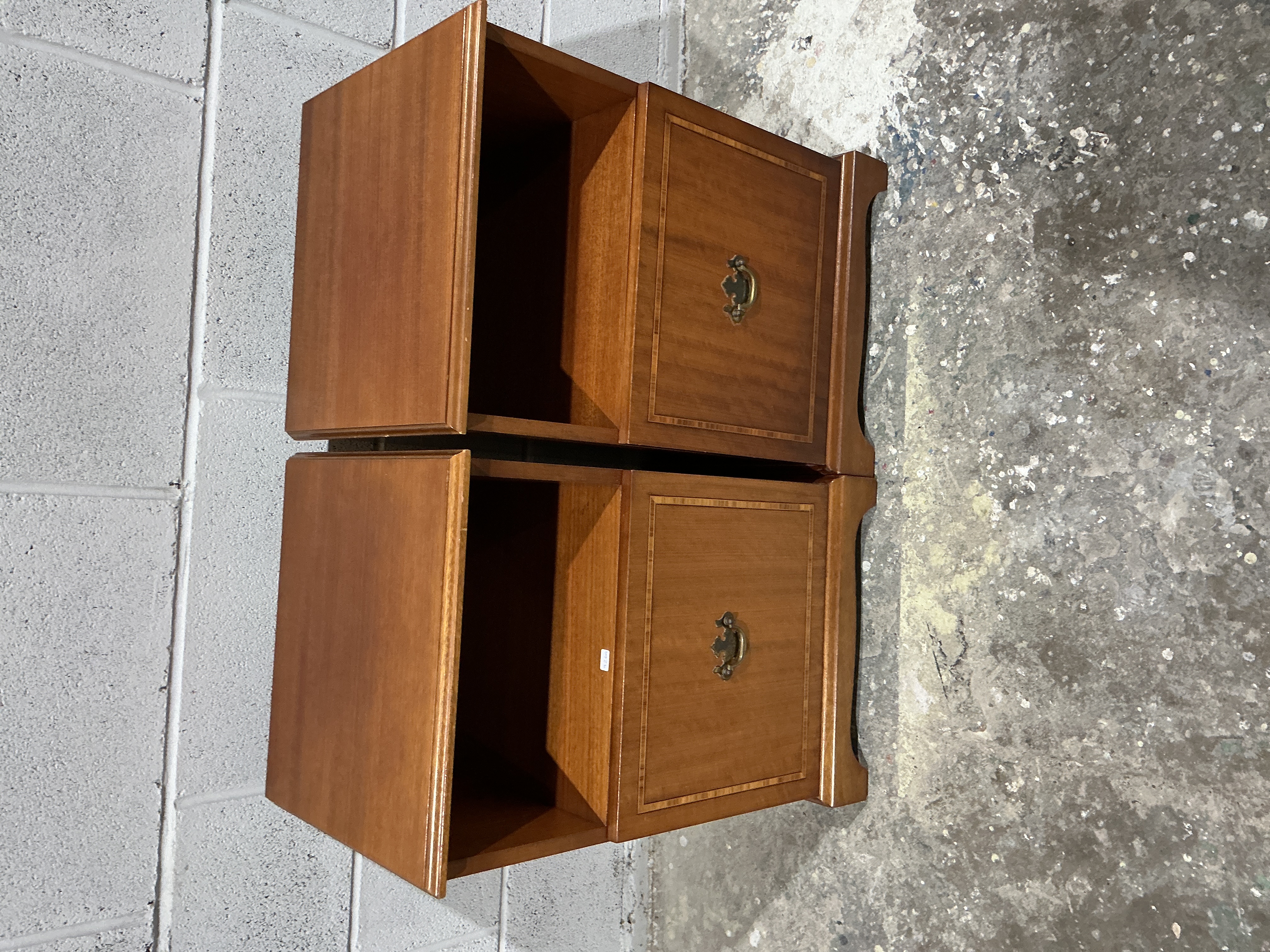 A pair of stackable cabinet modules executed in a Revival or traditional style. Each unit features a medium reddish-brown wood veneer finish. The front of each module is characterized by a single compartment accessed via an outward-opening door. The doors are decorated with recessed panels framed by lighter-toned inlay or stringing, suggesting a Neoclassical influence. Each door is fitted with a brass shield-and-drop handle and escutcheon. The front edges of the units feature shaped or scrolled stiles. The modules are designed to stack vertically, providing flexible storage. A small white label is visible inside the lower unit but is illegible.