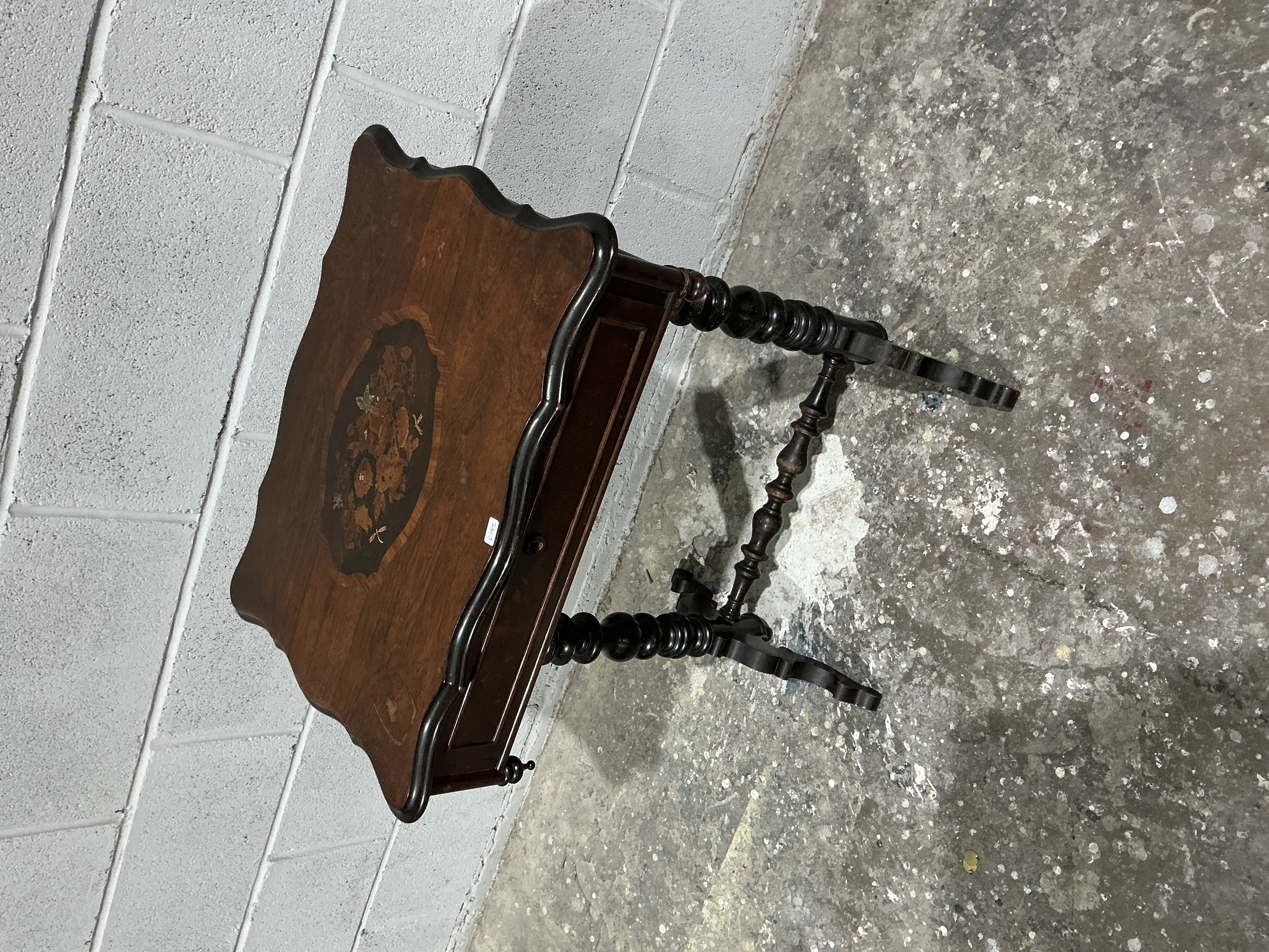 A single late Victorian period work table or sewing box, dating to the late 19th century. The piece is constructed primarily of mahogany or walnut and features a lift-top case with serpentine or scalloped edges. The stand is characterized by four heavily turned legs, consistent with the “barley twist” style identified in research, connected by stretchers. The legs are ebonized or dark-stained, contrasting with the lighter wood of the case. The hinged lid is inlaid with a central oval floral marquetry panel composed of various woods. The case opens via brass hinges to reveal a fitted interior, characteristic of a tea caddy or sewing box, containing five small drawers fitted with brass knobs, alongside several fixed compartments.