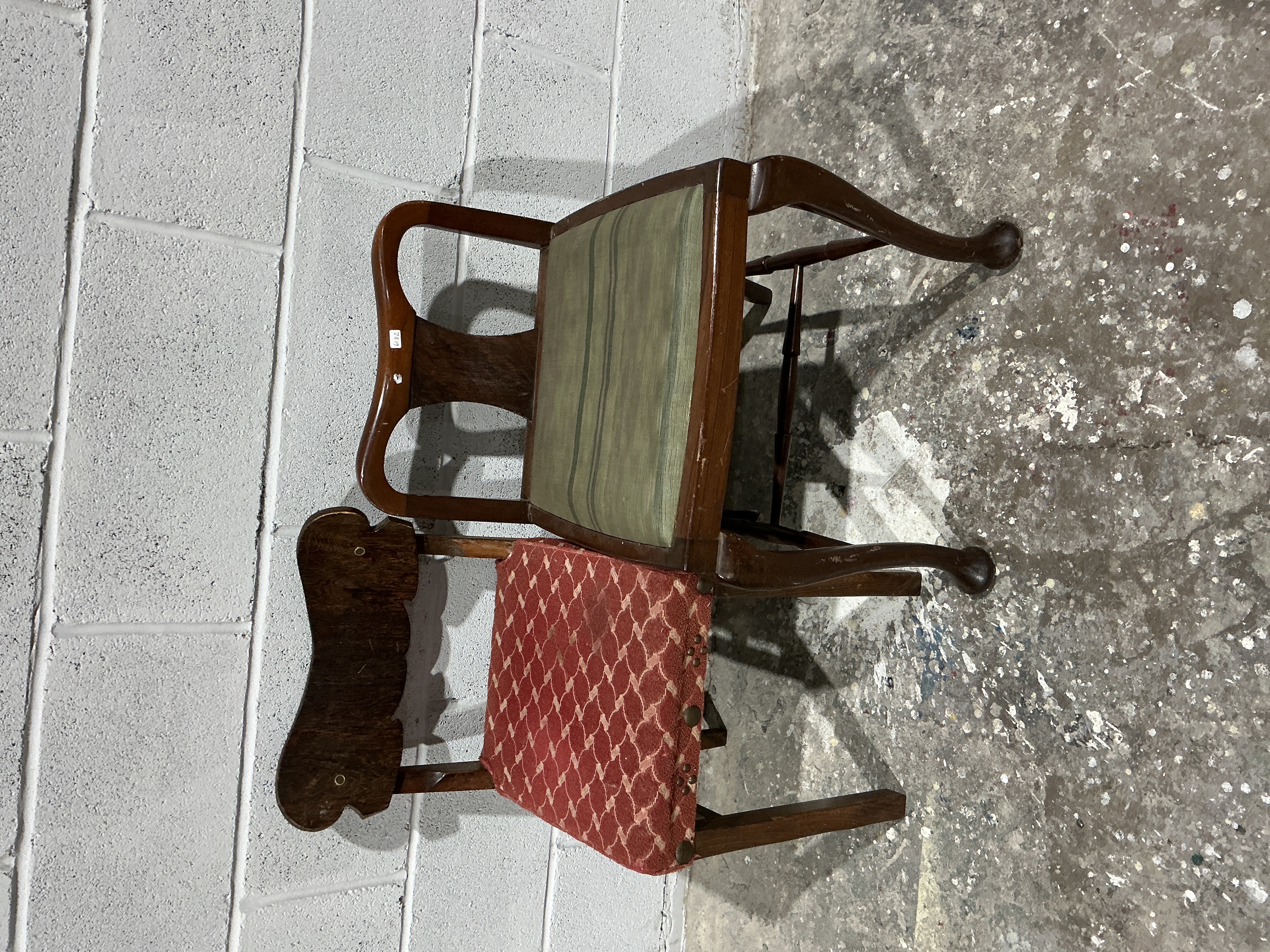 A pair of antique or vintage side chairs constructed with dark-stained hardwood frames, likely mahogany or a similar species. The chairs feature upholstered drop-in seats, though the frames and styles differ. The first chair features a curved crest rail, stylized cabriole front legs terminating in ball feet, and a seat upholstered in green and dark striped fabric. A small inventory sticker marked 272 is adhered to the back rail of this chair. The second chair has a simpler, squarer frame with a shaped, carved wooden back splat and a seat upholstered in a red patterned textile, secured by visible metal tacks. Both items exhibit construction consistent with age.