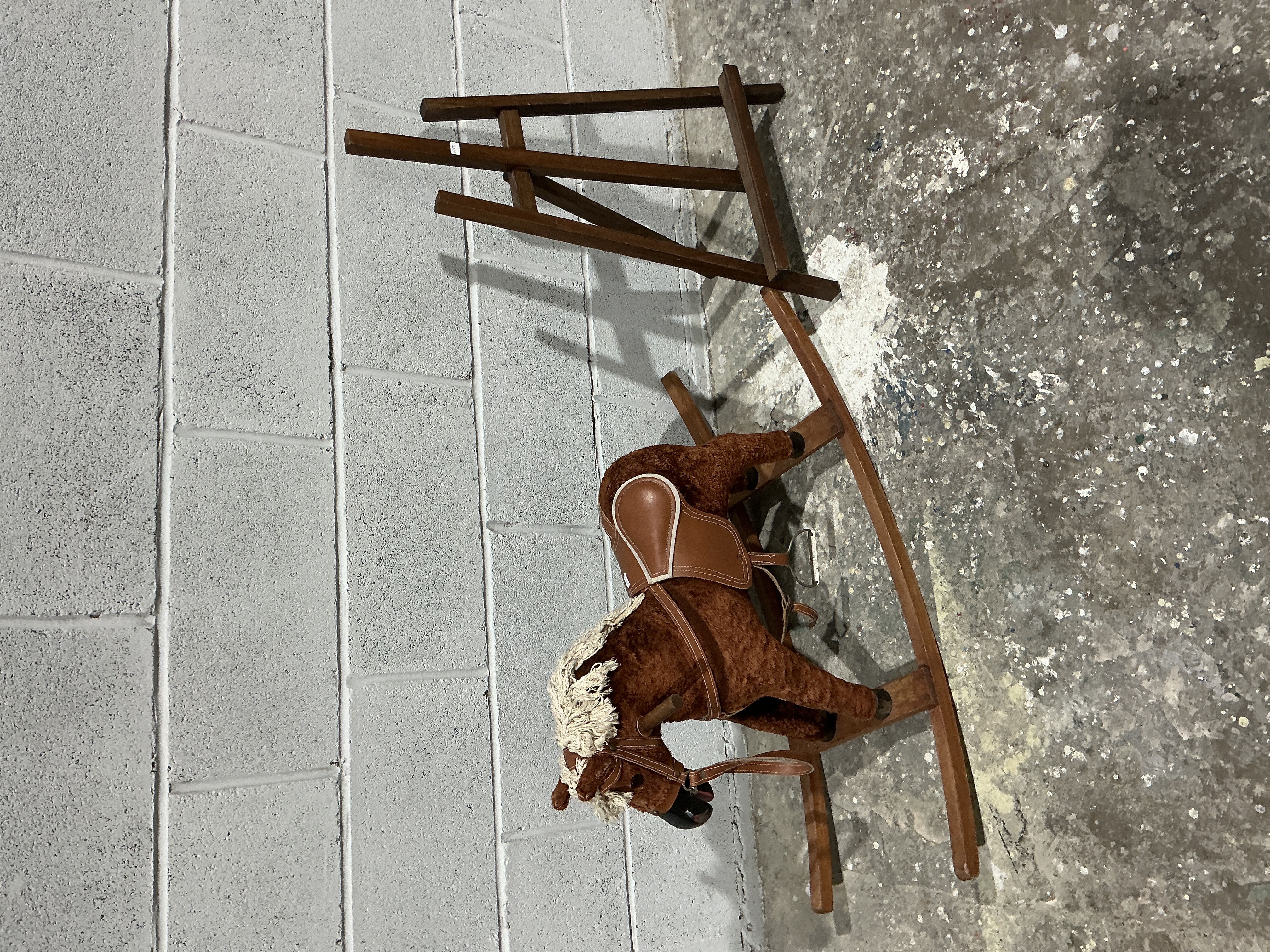 A Vintage-Style Plush Rocking Horse on Dark-Stained Wooden Rocker With Art Easel