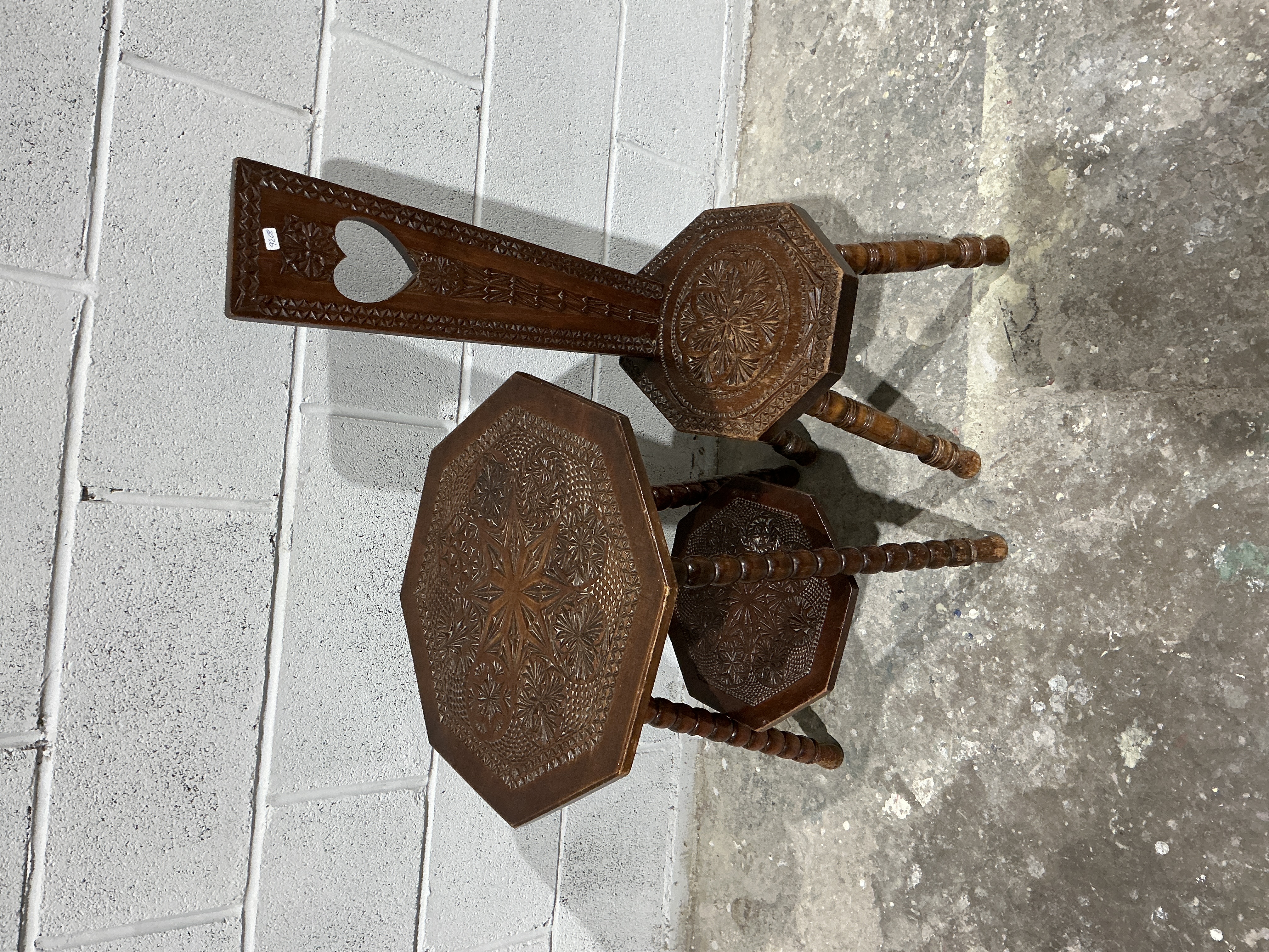 A pair of carved furniture items, consisting of a two-tiered side table and a coordinating low chair, constructed from dark-stained wood, likely oak, consistent with 19th or early 20th-century English folk art styles. Both pieces feature octagonal forms heavily decorated using deep chip carving techniques, presenting concentric geometric and floral relief patterns across the tops and seats. The table stands on turned spindle legs and includes a lower octagonal shelf, also carved. The chair has a matching carved octagonal seat and a tall, narrow backrest distinguished by a heart-shaped cutout at the top. A small white inventory sticker bearing the number 9268 is affixed to the upper back of the chair.