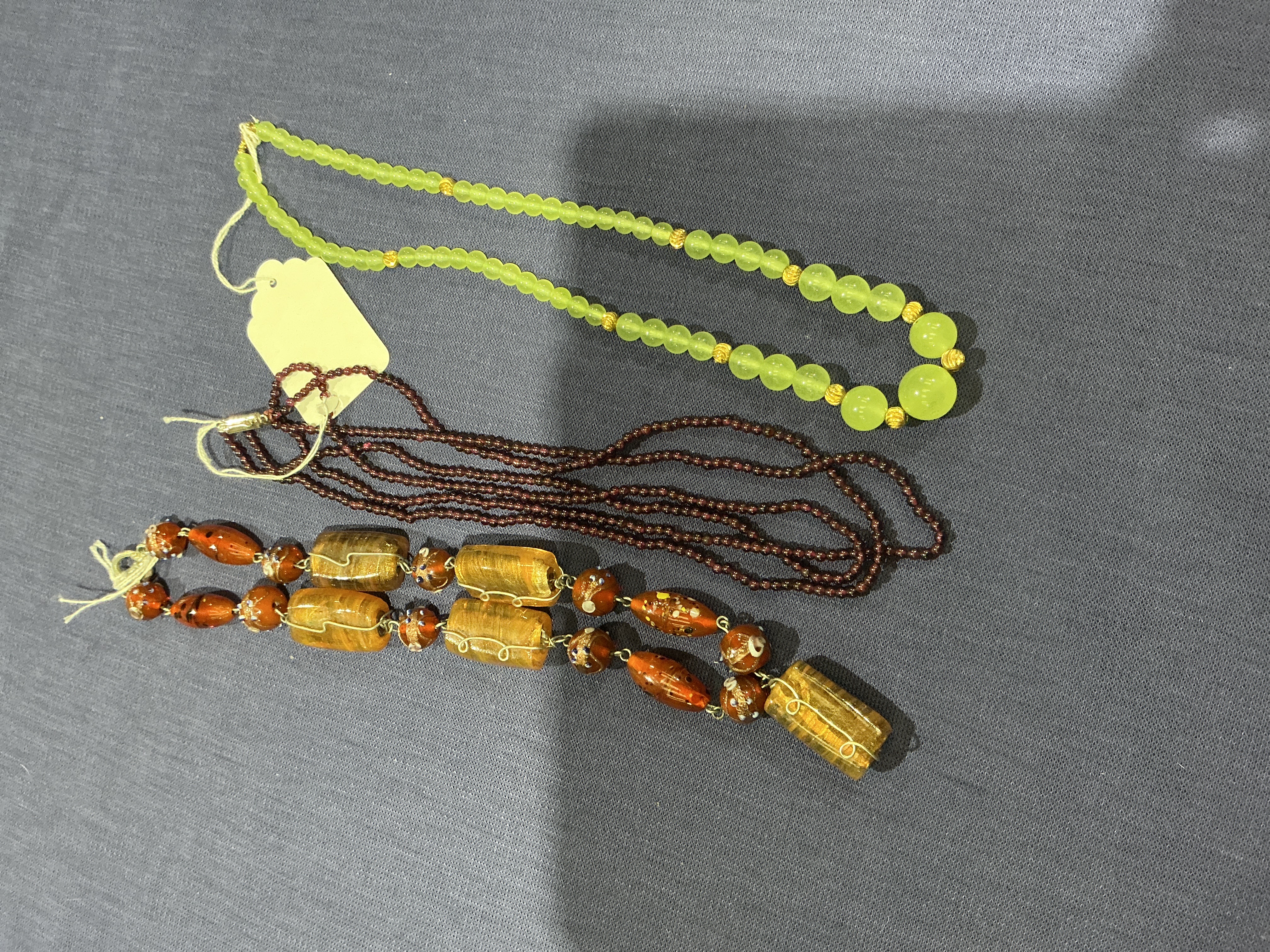 All items appear to be in good used condition. Clasps are functional. The green necklace retains a paper retail tag. The artisan necklace has a temporary string tie at one end. No missing beads or significant damage noted.