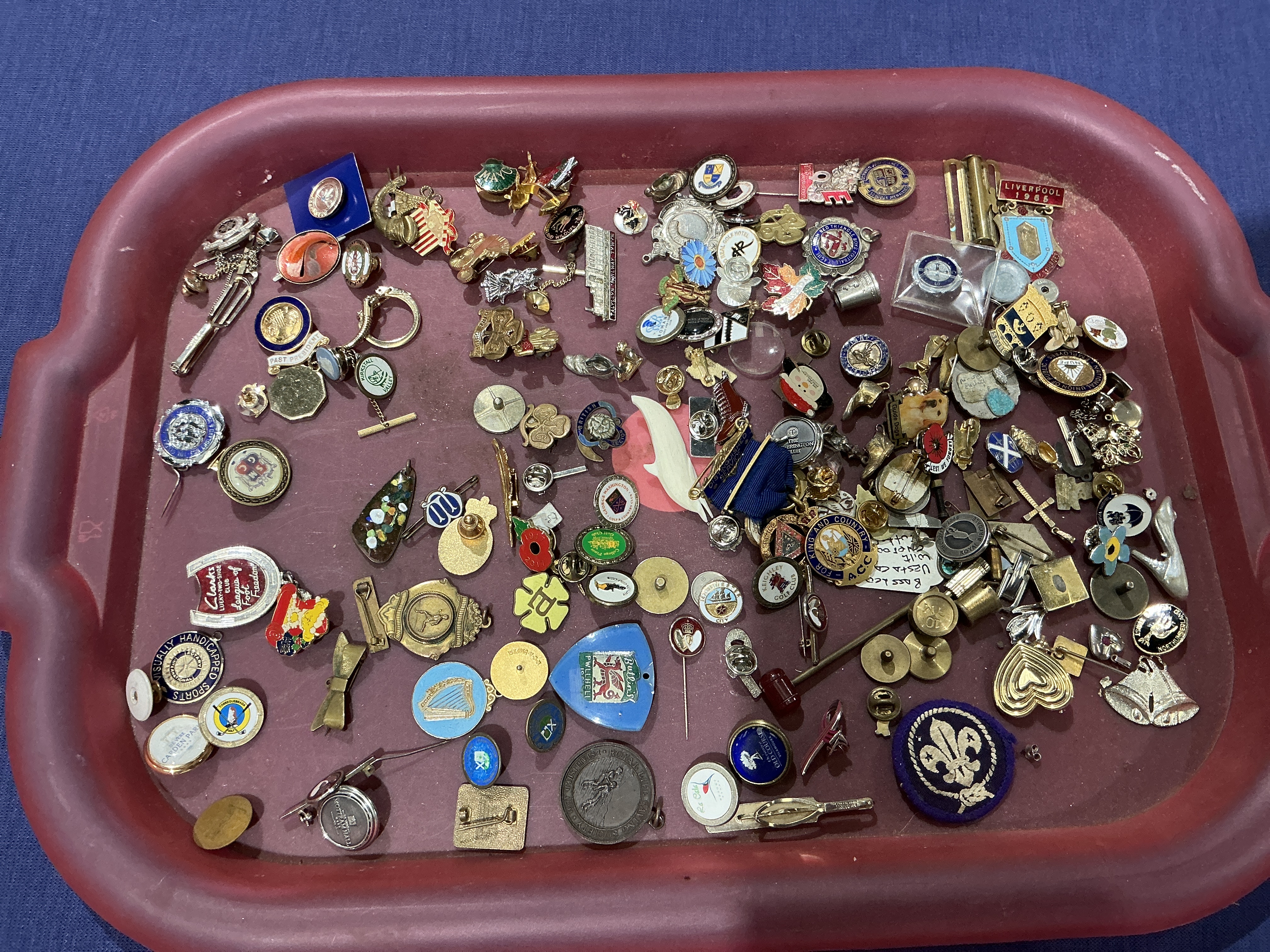 An extensive and eclectic assortment of commemorative, organisational, and sporting badges, lapel pins, and charms. The collection features a wide array of British and regional interest items, notably a Welsh dragon shield, a Pwllheli souvenir pin, and a Northumberland crest. Organisational insignia are well-represented, including several Scout Association fleur-de-lis pins and a felt patch, alongside Royal British Legion-style poppies and various social club emblems such as the ACC. Sporting highlights include a Liverpool 1968 commemorative piece and a Clarks Lucky-Two-Shoe League of Football badge. Construction materials primarily consist of gilt, silver-tone, and brass metals with cold and vitreous enamel finishes. The lot also includes fabric elements such as a blue ribbon and a small embroidered patch. Notable text includes Visually Handicapped Sports, King and Country, and various regional identifiers. These items provide a social history of mid-to-late 20th-century British clubs and commemorations. Measurements: Items vary in size from 10mm to 50mm; presented in a tray approximately 400mm x 300mm.
