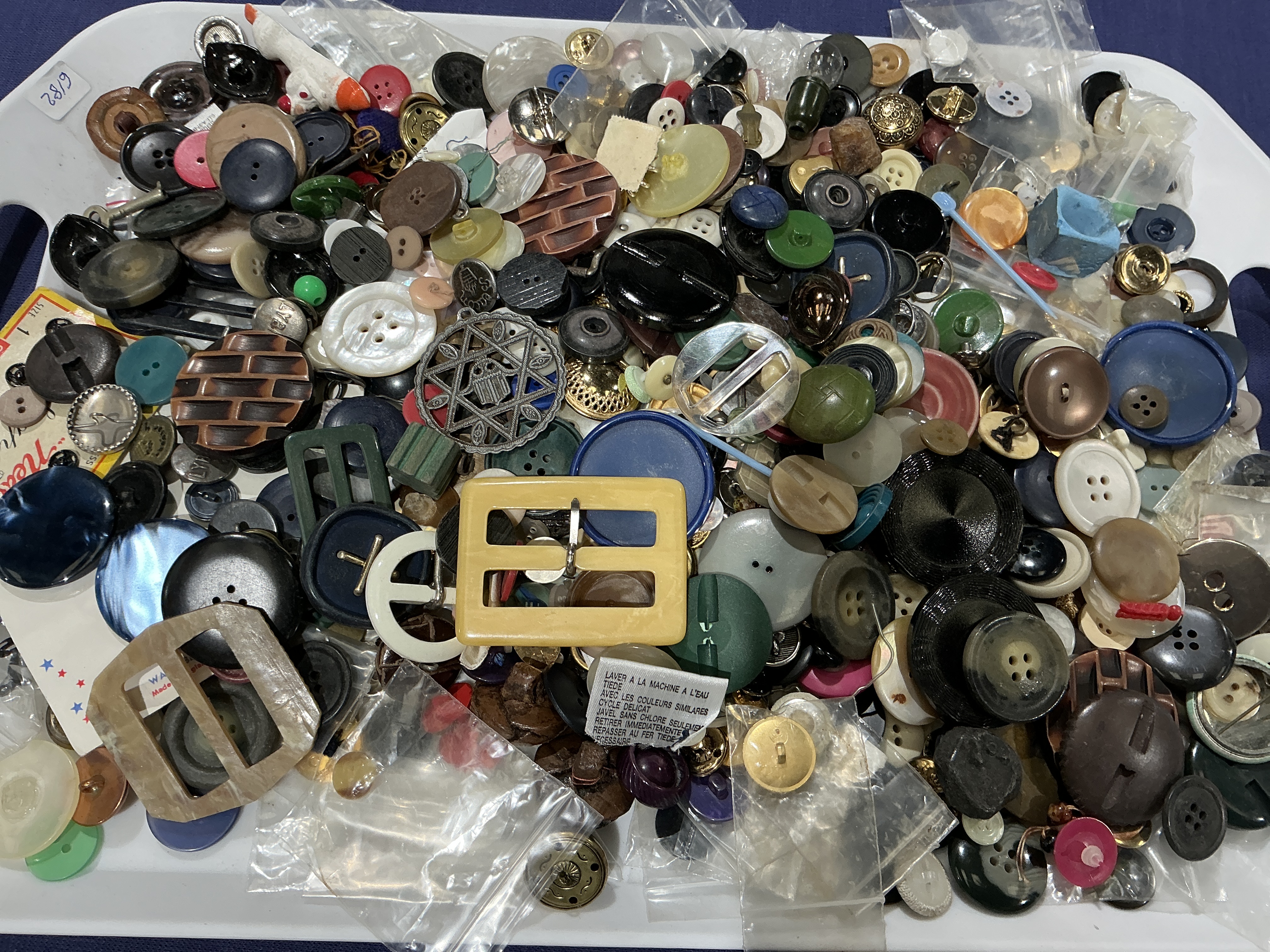 An assortment of vintage and modern sewing buttons, buckles, and related notions. The collection features a diverse array of materials including moulded plastic, mother-of-pearl, various metals, wood, and glass in a multitude of sizes, colours, and designs. Notable items include several large rectangular plastic and shell-effect buckles, decorative metal buttons, and numerous four-hole and shank-style buttons. A portion of the items are organised within small plastic bags. Visible text includes French laundering instructions on a tag reading LAVER A LA MACHINE A L’EAU TIEDE and a small sticker marked 6/82.