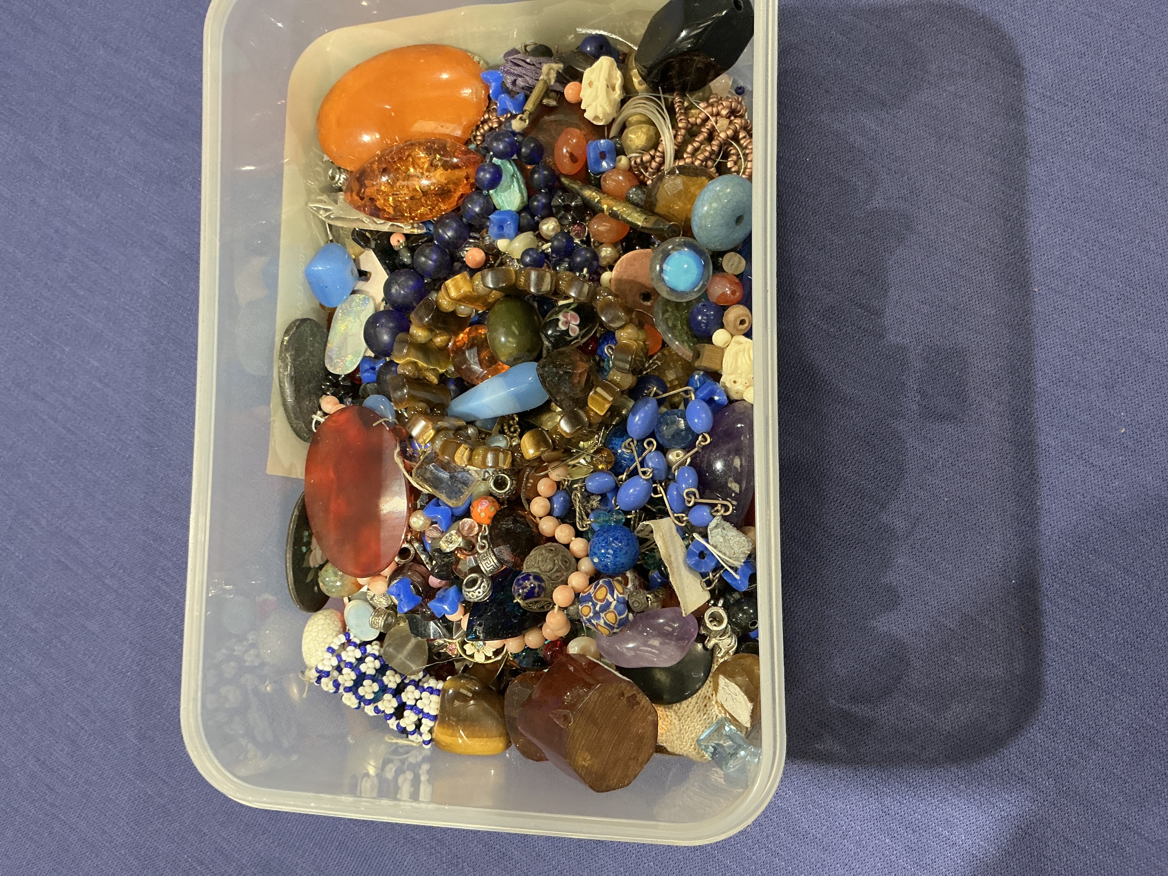 This lot comprises a diverse collection of costume jewellery and loose components. The assembly features assorted metal findings in both silver and gold tones; these appear to be base metal or plated as no hallmarks or purity stamps are visible. The collection includes a variety of materials that appear to be lapis lazuli, turquoise, amethyst, tiger’s eye, and possible coral. Notable features include large polished cabochons in orange and deep red hues that appear to be amber or resin. The items range from strung necklaces and bracelets to loose beads of various shapes and colours, including glass, mother-of-pearl, and shell. Construction techniques include bead stringing and basic wire work for earrings and charms. The items are presented in a mixed, unsorted state. Weight and measurements are not provided.