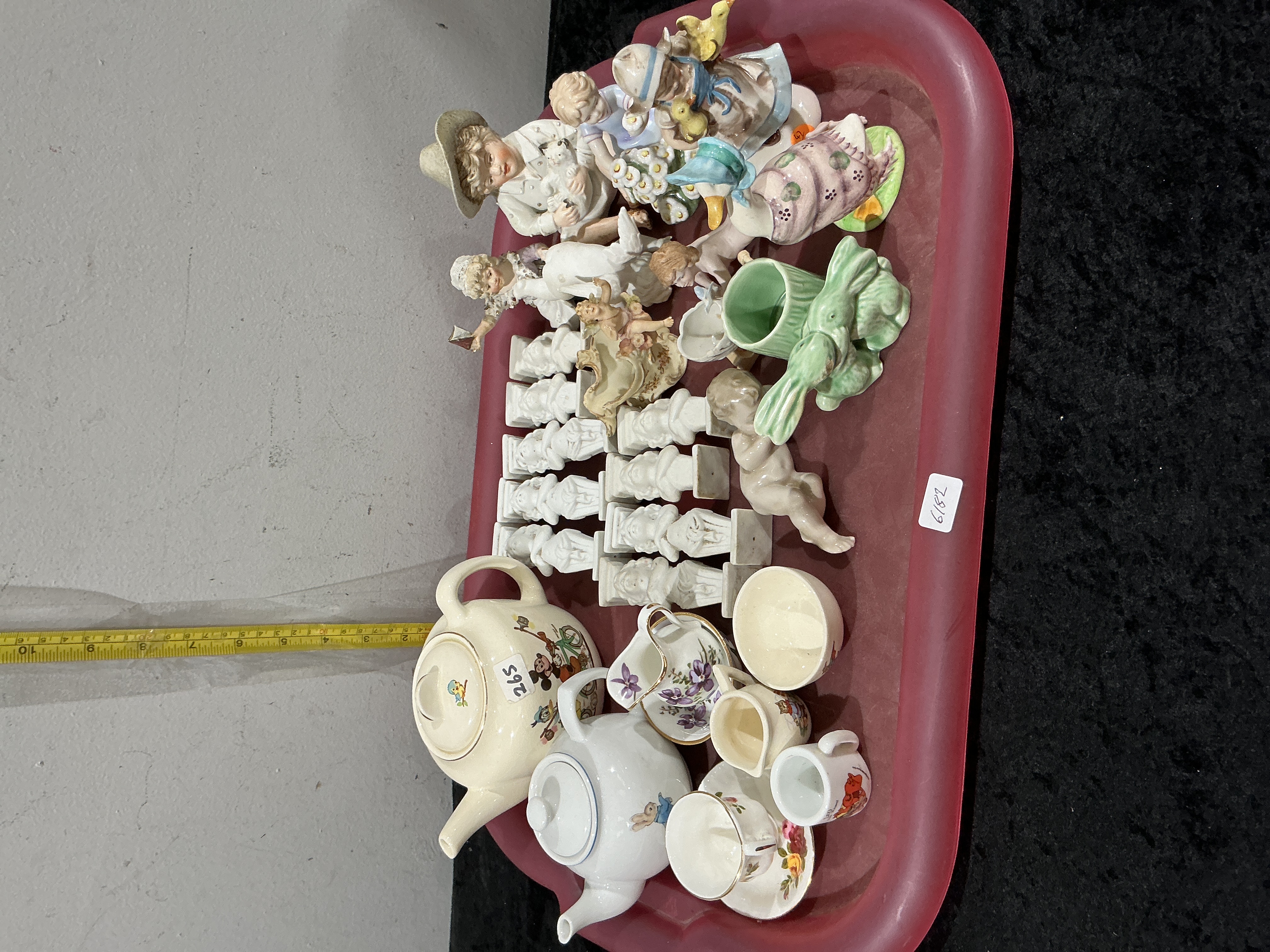 A diverse tray lot of ceramic and porcelain decorative wares, predominantly dating from the mid-to-late 20th century. The collection includes two small teapots: one cream-glazed example featuring Disney Mickey Mouse transfer-printed decoration, and a white-glazed teapot with Beatrix Potter motifs. The assortment of figurines comprises several polychrome hand-painted pieces, including a boy with a dog in the Hummel style, a girl with ducks, and various cherubic and angelic figures. Notable is a green-glazed anthropomorphic figural vessel, possibly a spill vase or match holder. Additionally, the lot contains a set of twelve uniform white-glazed figures, likely moulded in a seated pose atop rectangular plinths, alongside various pieces of miniature floral-patterned teaware including cups and creamers. Tray measures approximately 45 cm in length.