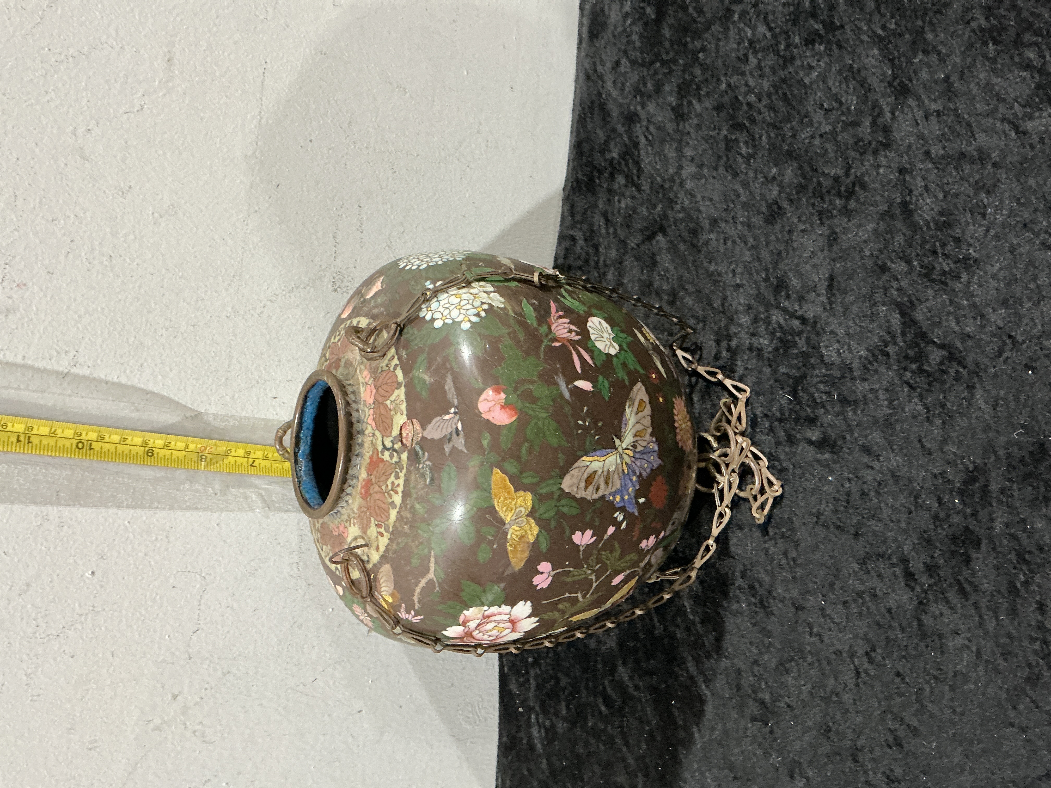 A Chinese cloisonne enamel hanging vessel of globular form, likely dating to the late 19th or early 20th century. The piece is constructed from an enamelled metal body, probably brass, featuring a deep chocolate brown ground. The exterior is intricately decorated with polychrome motifs of butterflies and various flowering plants, including peonies and chrysanthemums, rendered in vibrant colours. A decorative foliate band on a light-coloured ground encircles the shoulder of the vessel. The interior is finished with a characteristic bright turquoise blue enamel. The vessel is fitted with a wirework metal harness and a linked suspension chain for hanging. Width: Approximately 8 to 9 inches.
