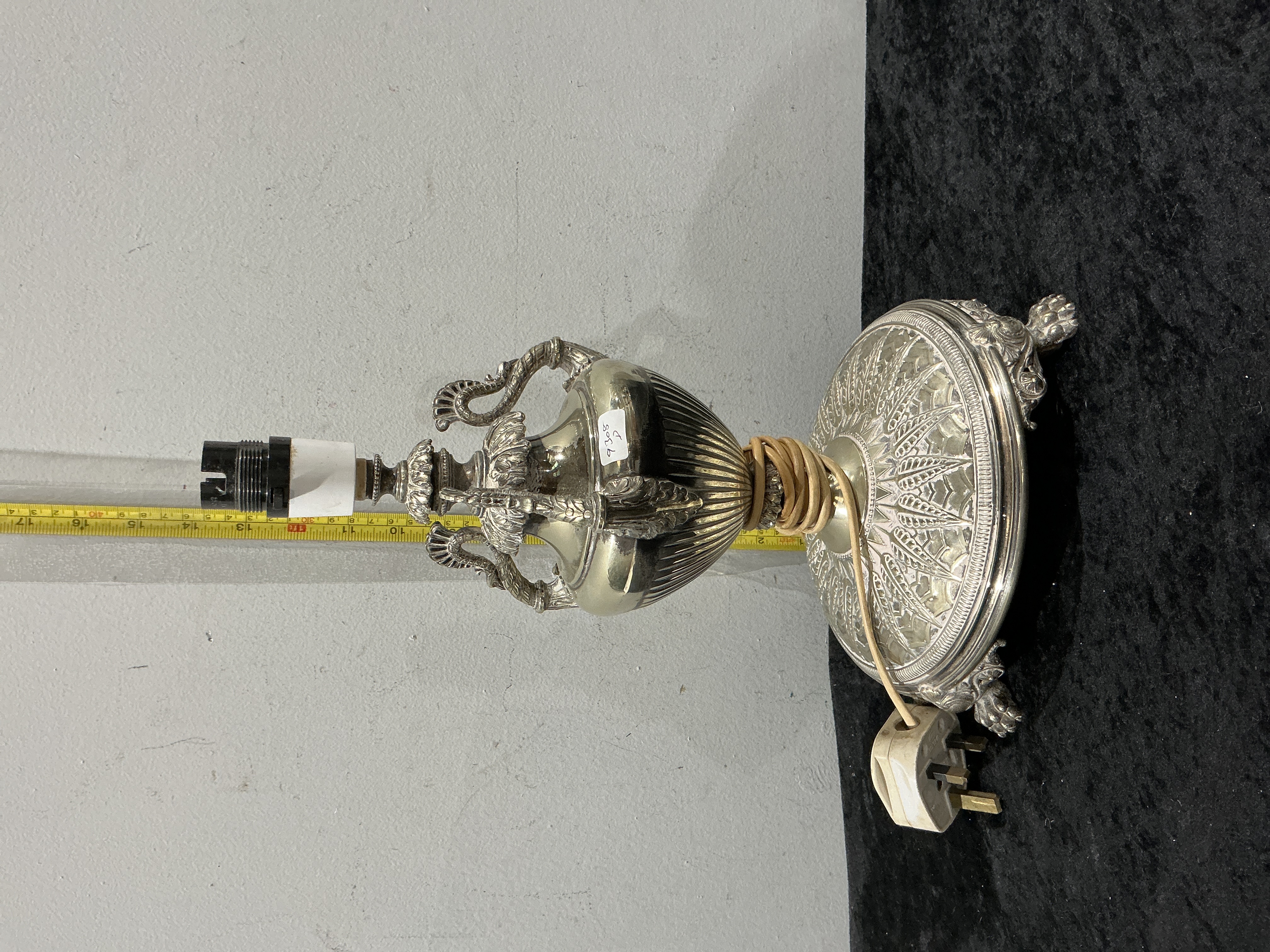 An ornate silver-plated table lamp base, designed in the Baroque and Neoclassical styles. The urn-form body features gadrooned detailing and twin scrolling foliate handles. The flared, circular base is heavily embellished with repoussé-style geometric and floral motifs, supported by three decorative lion-paw feet. The piece is electrically wired with a tan cord and a standard UK three-pin plug. A small inventory sticker marked 9305 P is present on the side. Height: Approximately 38 centimetres (15 inches) to the top of the socket.
