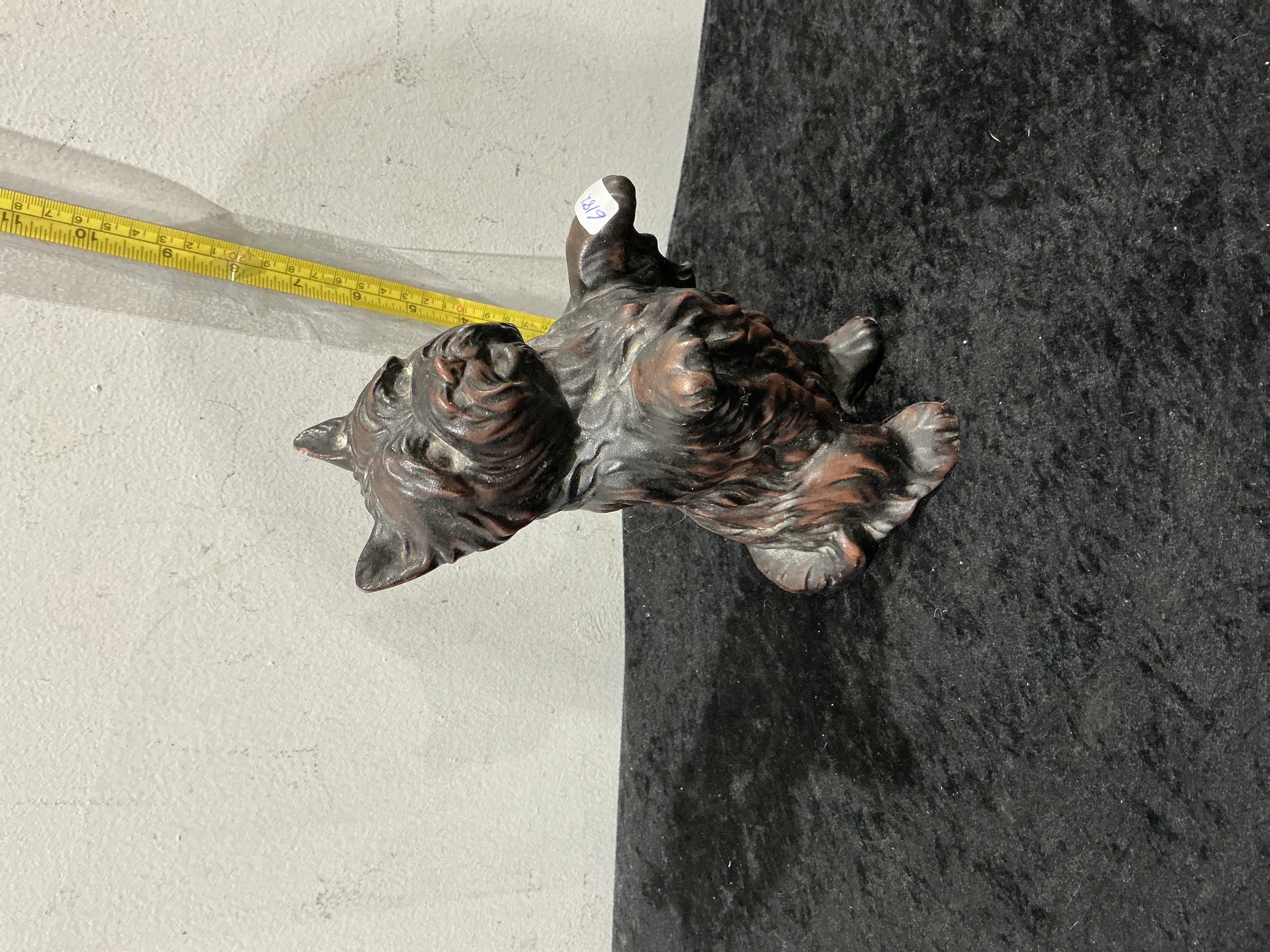 A vintage cast metal figurine depicting a Scottish Terrier, likely produced as a decorative doorstop or hearth ornament, mid-20th century. The piece is naturalistically modelled with a textured surface to represent the breed’s wiry coat, finished with a dark bronze-toned patina and accented with reddish-brown cold-painted highlights. The underside is flat and unfinished, revealing the raw casting, and lacks any discernible maker’s marks or hallmarks. Length: approximately 23 cm.