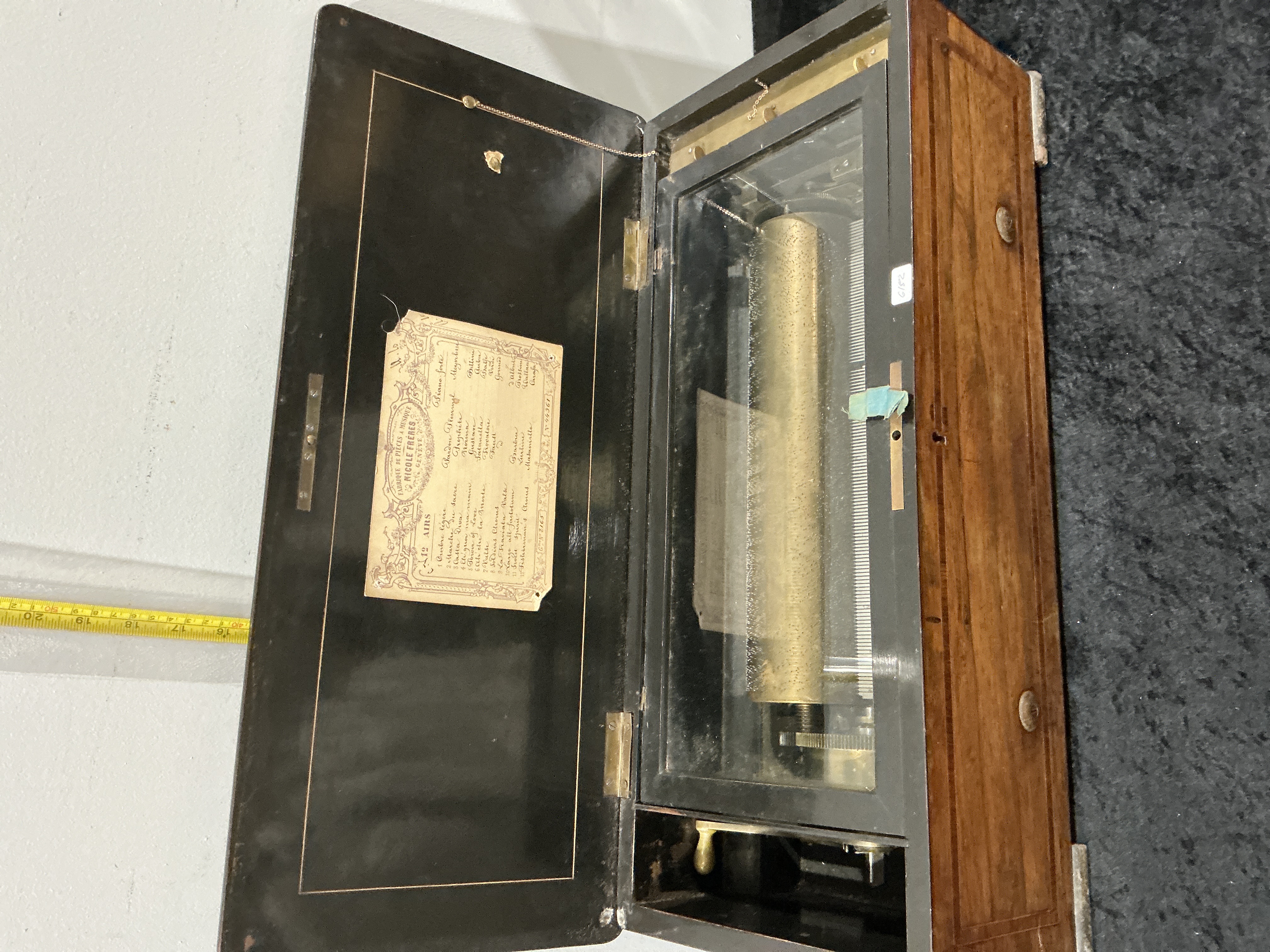 A fine antique Swiss cylinder music box manufactured by the prestigious Fabrique de Pieces a Musique Nicole Freres, Geneve. This specimen, bearing serial number 44361 and reference number G. me No. 2165, features a sophisticated twelve-air programme. The musical selection is noted on the original label as Piano-forte arrangements, featuring celebrated operatic works by composers including Verdi, Bellini, Meyerbeer, Gounod, and Rossini. The internal mechanism is visible beneath a secondary glass dust lid and comprises a substantial brass cylinder acting upon a single steel comb. The exterior rectangular case is crafted from wood, featuring a decorative floral marquetry inlay to the centre of the lid and protective metal-bound corners. The original lithographed programme label is affixed to the underside of the lid, detailing tracks such as Il Trovatore, Norma, and Faust. Length: approximately 51 cm (20 inches).